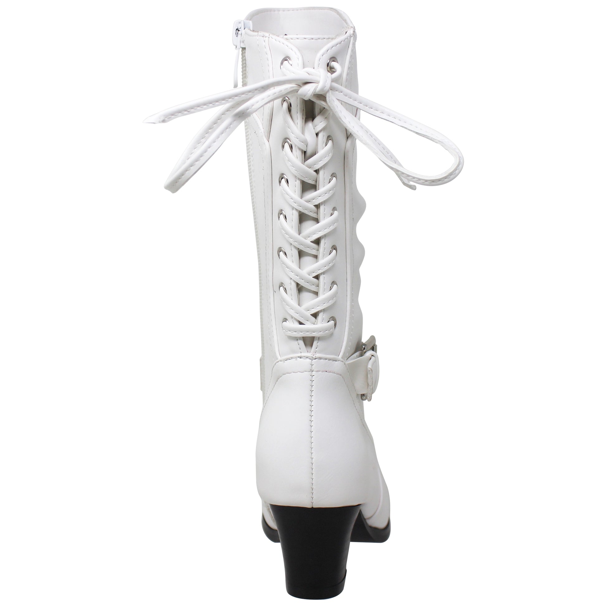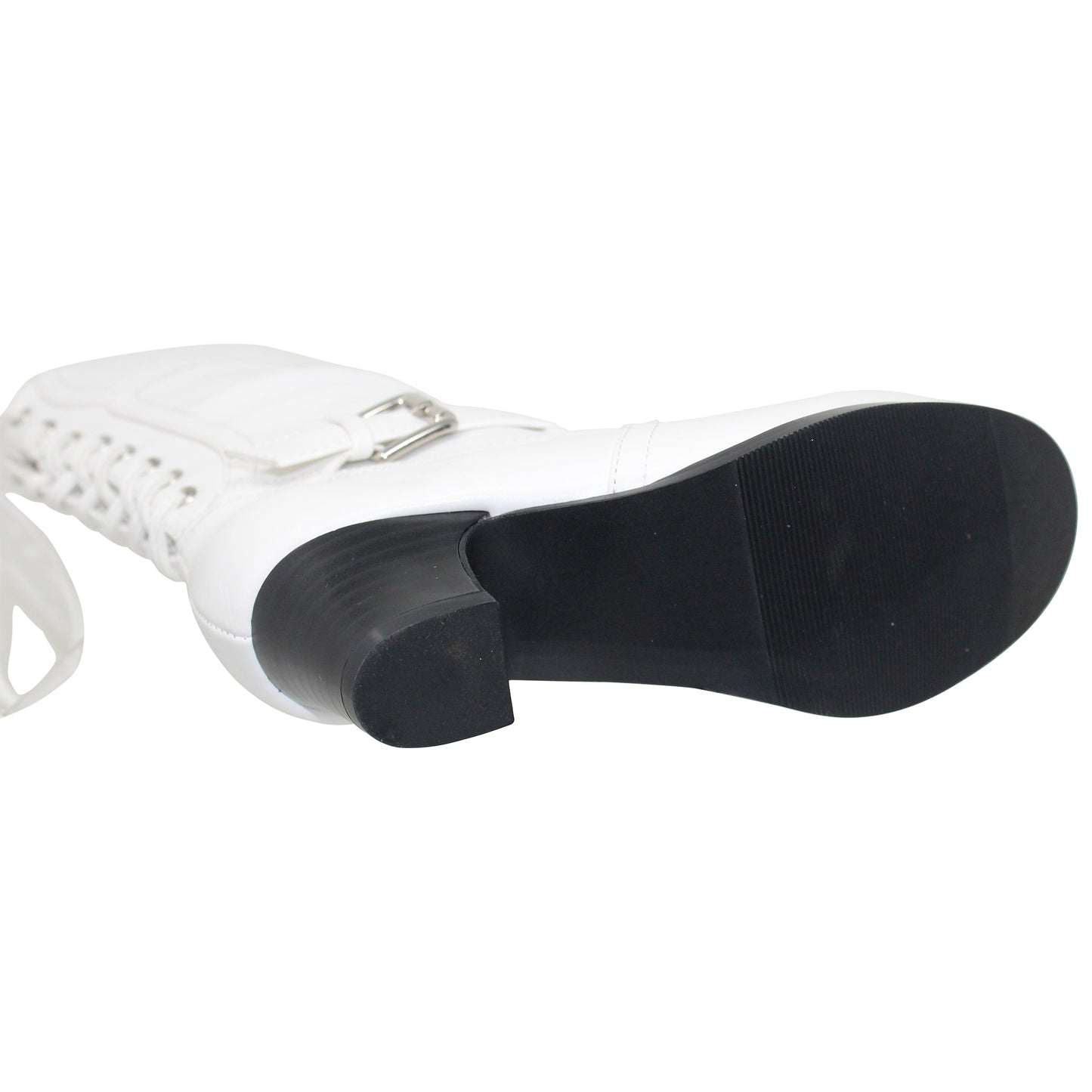 - Material: Man made leather, rubber sole. Features: Full length side zipper closure, buckle strap accent, lace up back