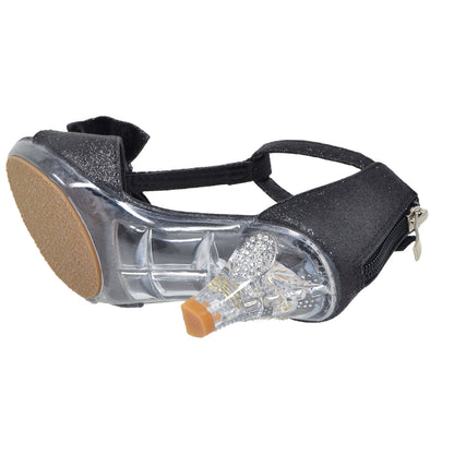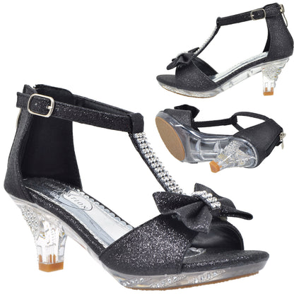 Awash in shimmery glitter, this glam sandal features a glitter-encrusted bow adorned with dazzling crystals that graces the toe of a stunning t-strap sandal balanced by a clear slim heel accented with sparkling crystals for a little lift.