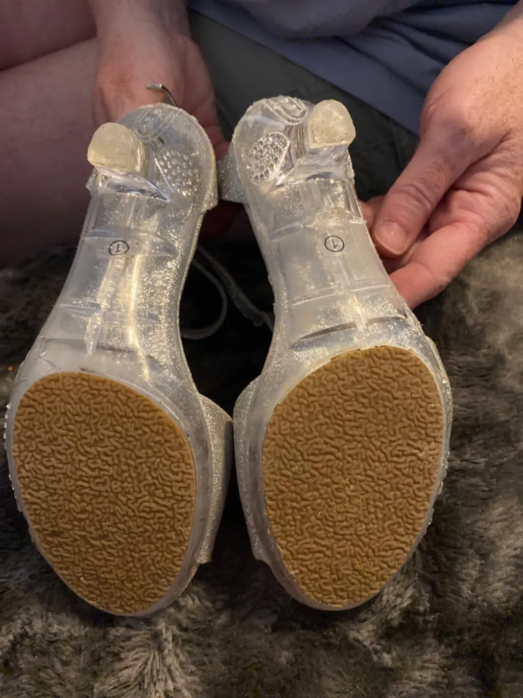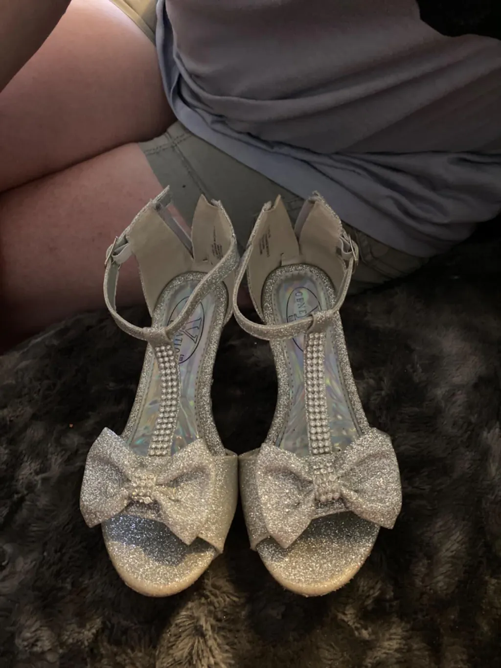 - Adjustable ankle strap with buckle closure, Back zipper closure, Bow accent, Glitter all-over, Rhinestone accent