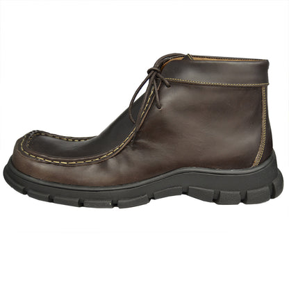 A hefty rubber tread sole grounds an earthy lace up ankle boot shaped from durable synthetic leather.