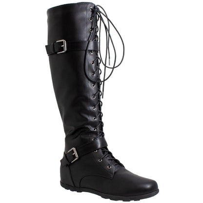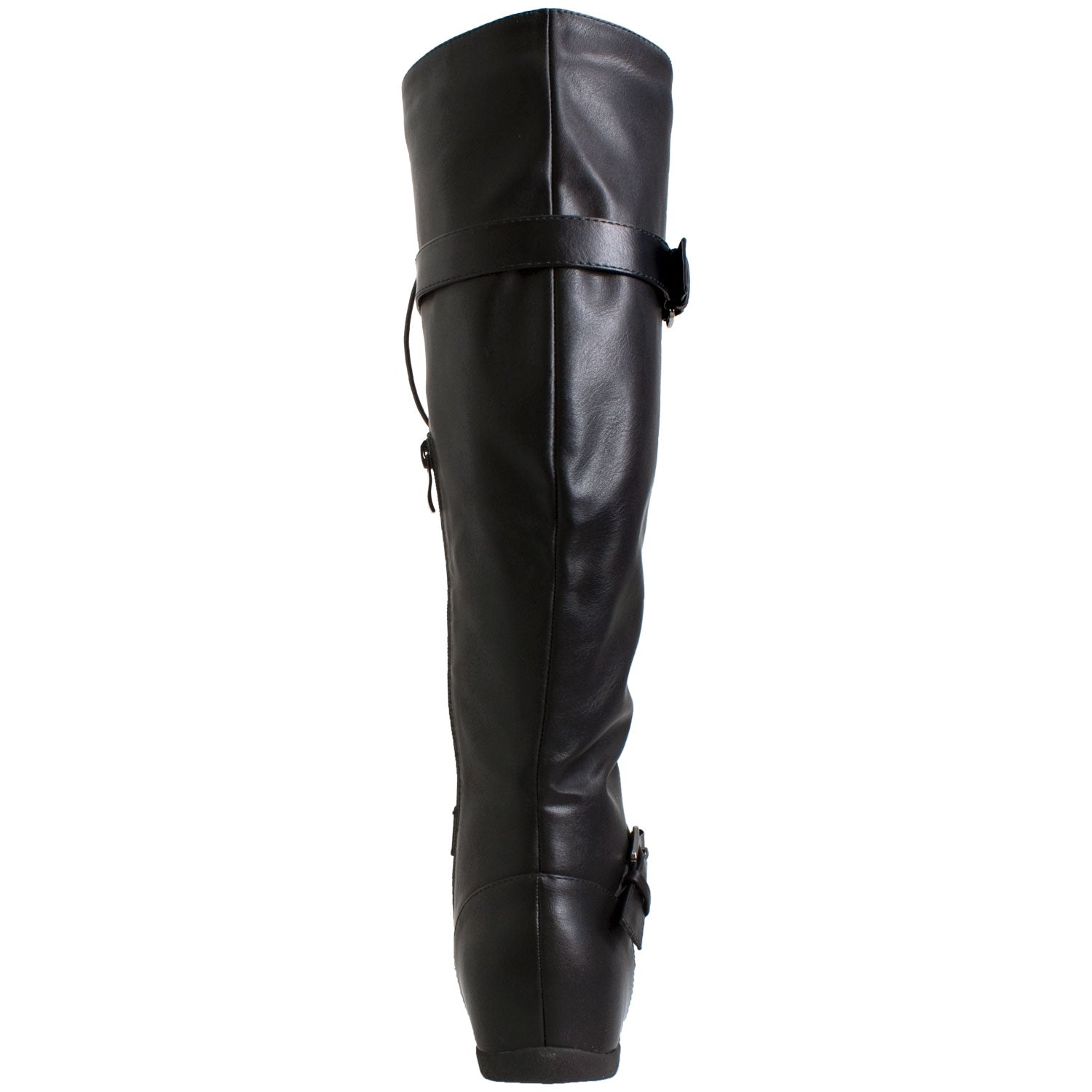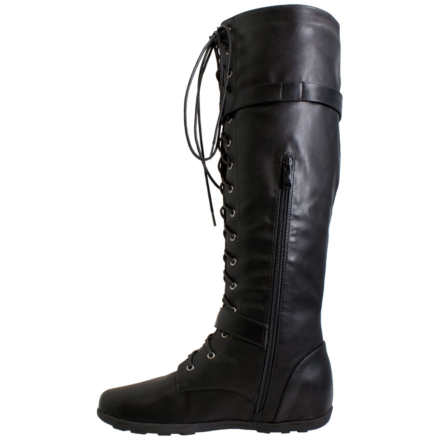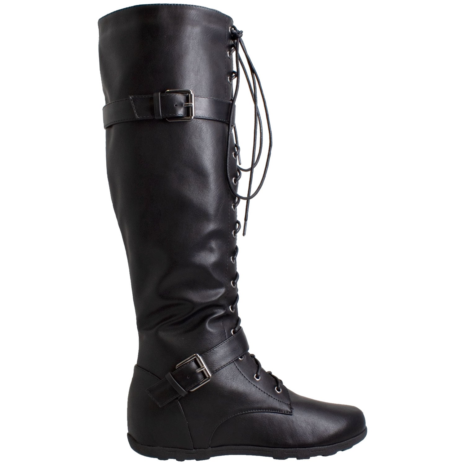 Material: All man-made Leather upper, Rubber Sole. Generation Y shoes are made with the best quality 100% vegan material. All our shoes have an additional cushion to provide comfort. - Hidden wrapped wedge: 1.25 inches approx; Platform: 0.4 inch approx; Boot Height: 17 inches approx; Boot Length: 10.25 inches approx; Boot Opening: 15 inches approx. Note that all measurements were taken with Size 7.