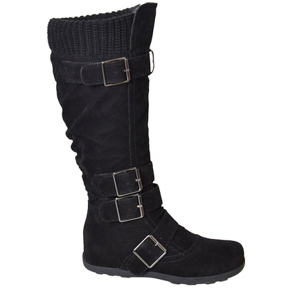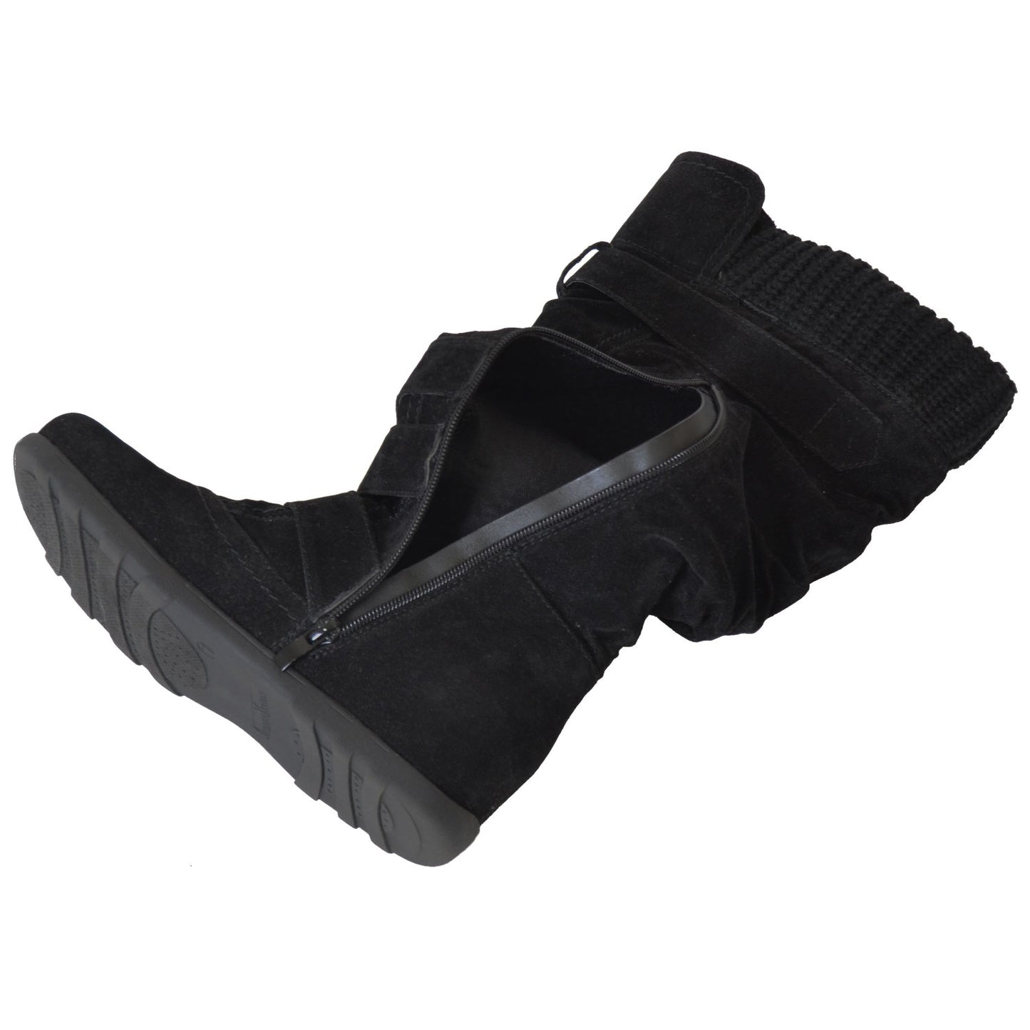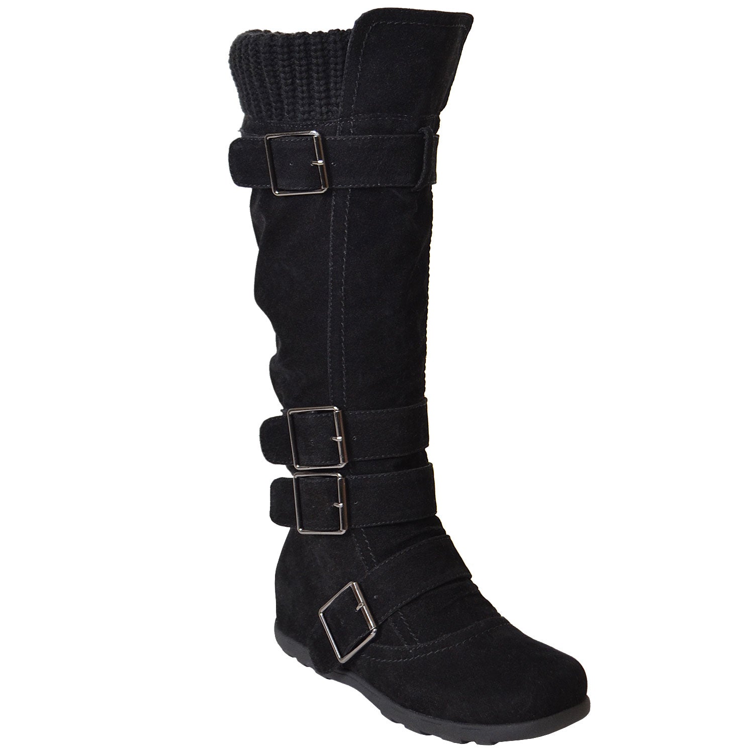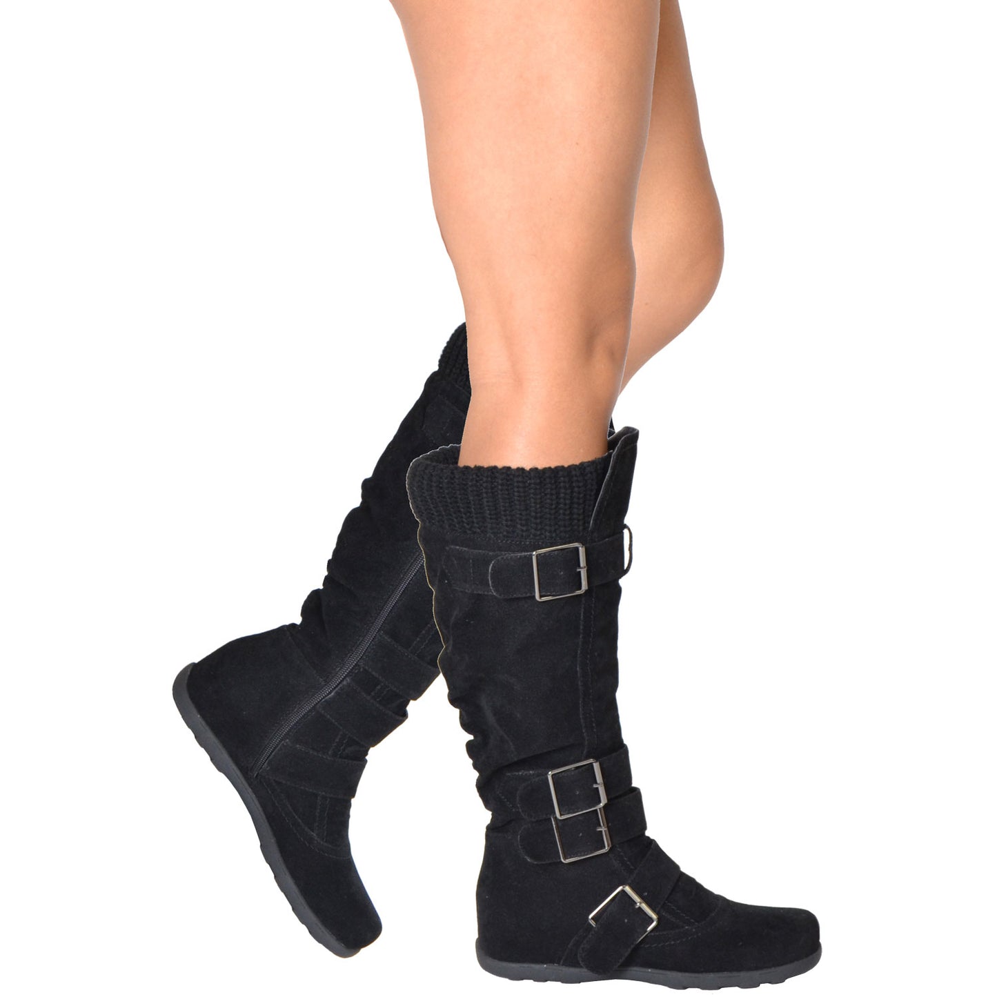 - Man made suede upper; rubber sole, hidden wedge, zipper closure, adjustable buckle straps, knitted calf. Generation Y boots are made with additional cushion for comfort.