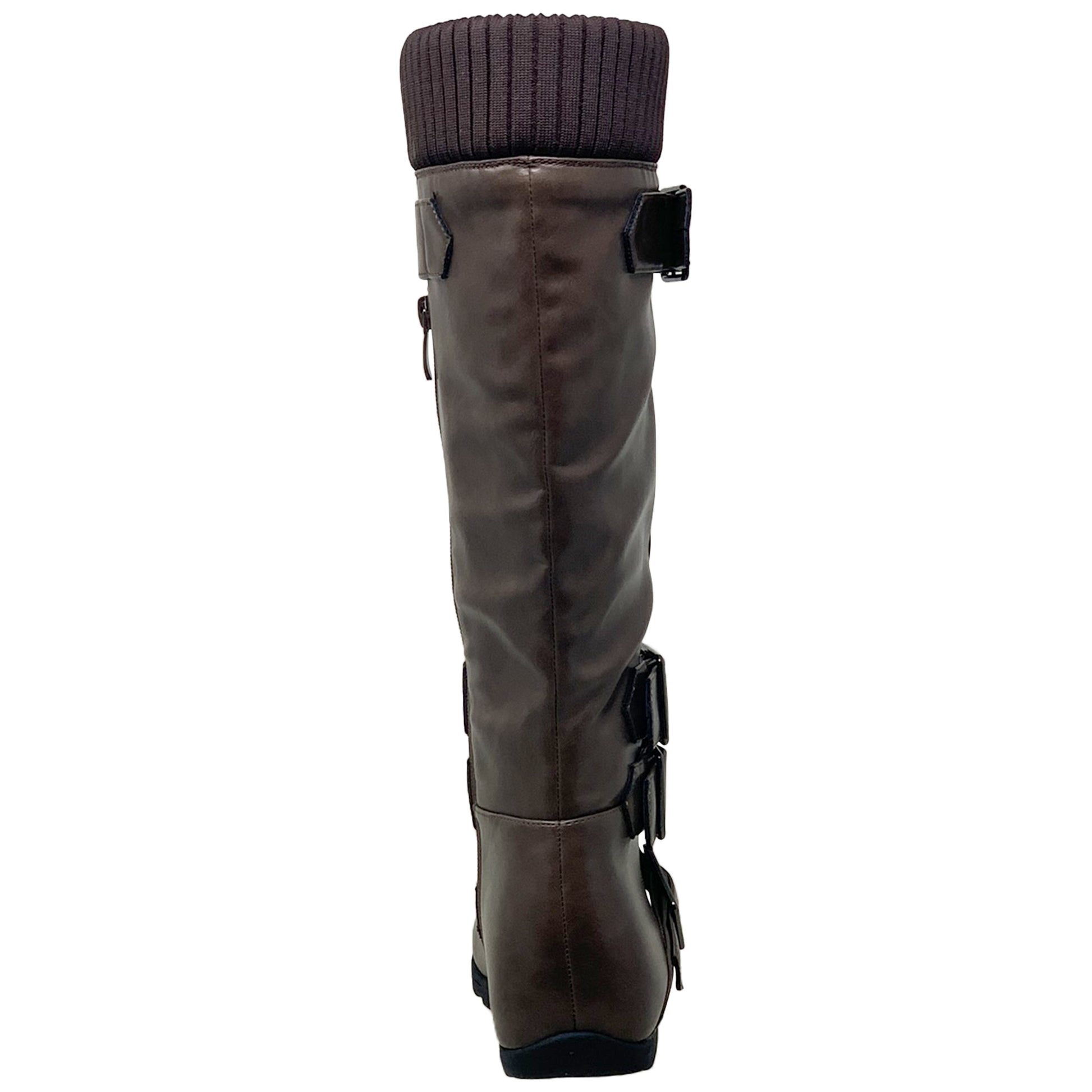 - Man-made Leather upper, rubber sole. Zipper closure, adjustable buckle straps, cushioned insole. Boot height- 15.5 in approx; Boot opening- 17 in approx.