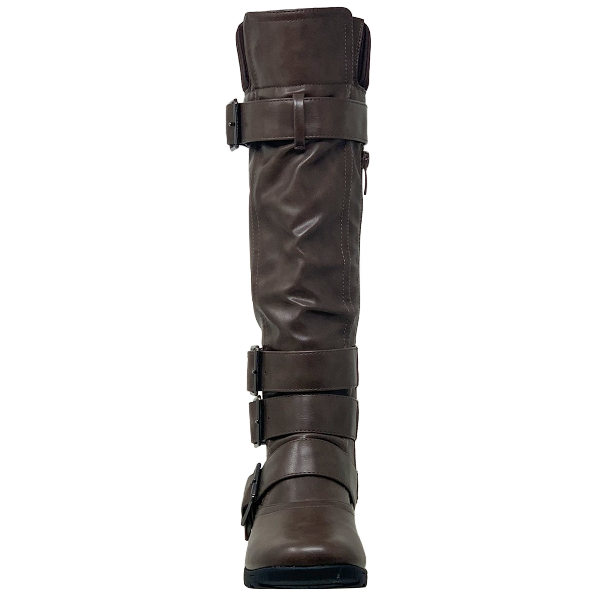 Crafted from soft, man-made leather, this knee-high boot will put some "oomph" in your everyday casual style. Vintage strappy buckles wrap around the ankle and shaft, adding an edgy vibe, while a cushioned insole provides comfort and support with every step.