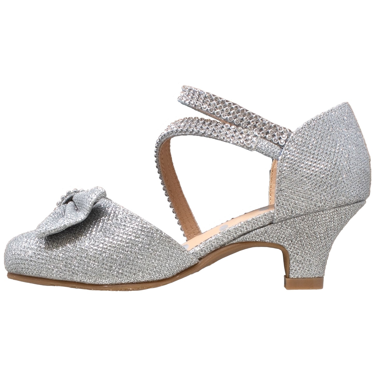 - Synthetic upper Glitter and lower. Rhinestone detail; Adjustable ankle strap; Bow accent. Length measurements from toe-to-heel: Size 11= 7.45 in, Size 12= 7.6 in, Size 13= 7.9 in, Size 1= 8.2 in, Size 2= 8.5 in, Size 3= 8.8 in, Size 4= 9 in, Size 5= 9.2 in