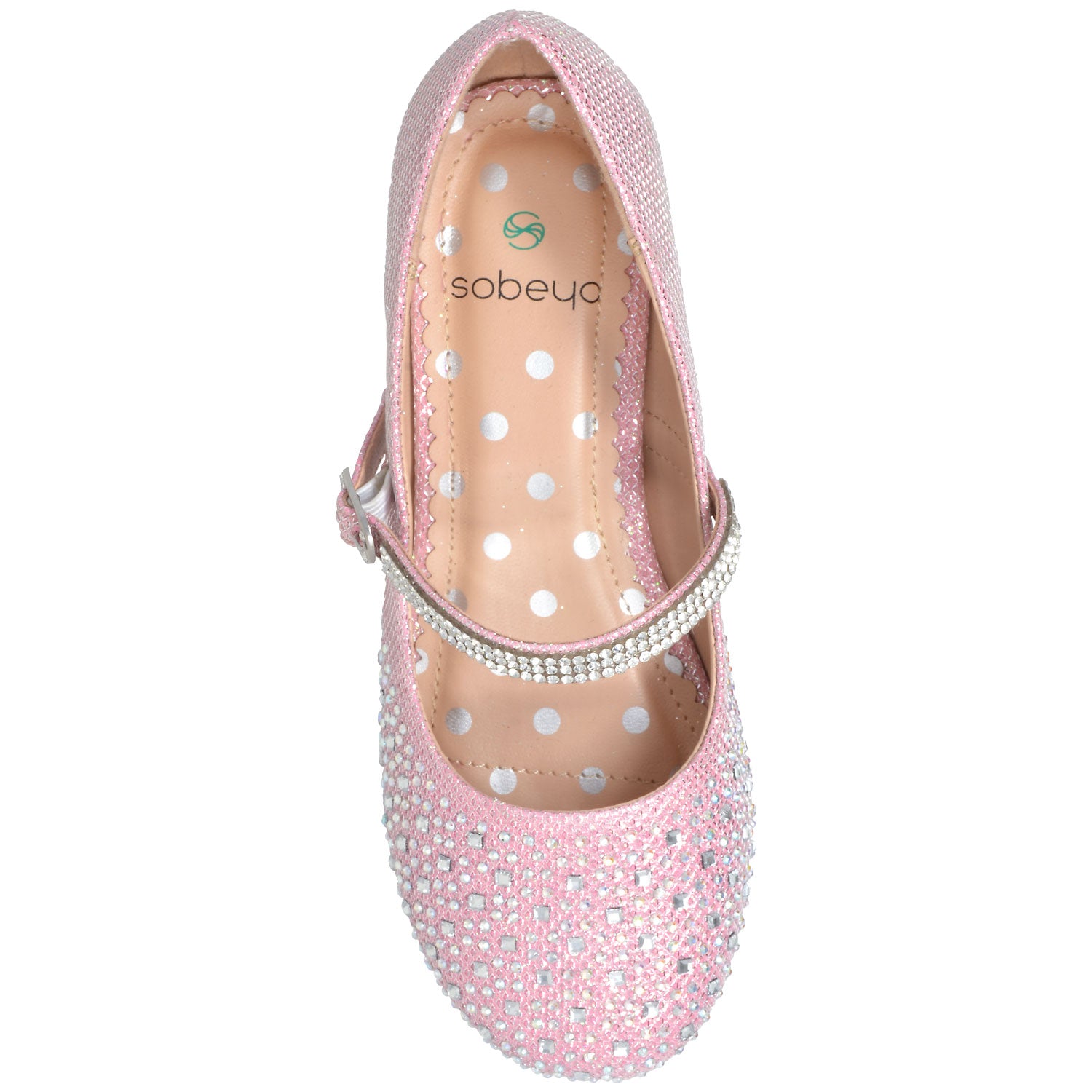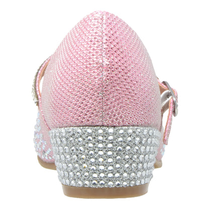 A shimmery glitter upper accented with dazzling crystals transform this classic Mary Jane favorite into a modern day darling. A slim ankle strapm and a tapered block heel covered with shiny rhinestones radiate glamorous city-chic vibes.