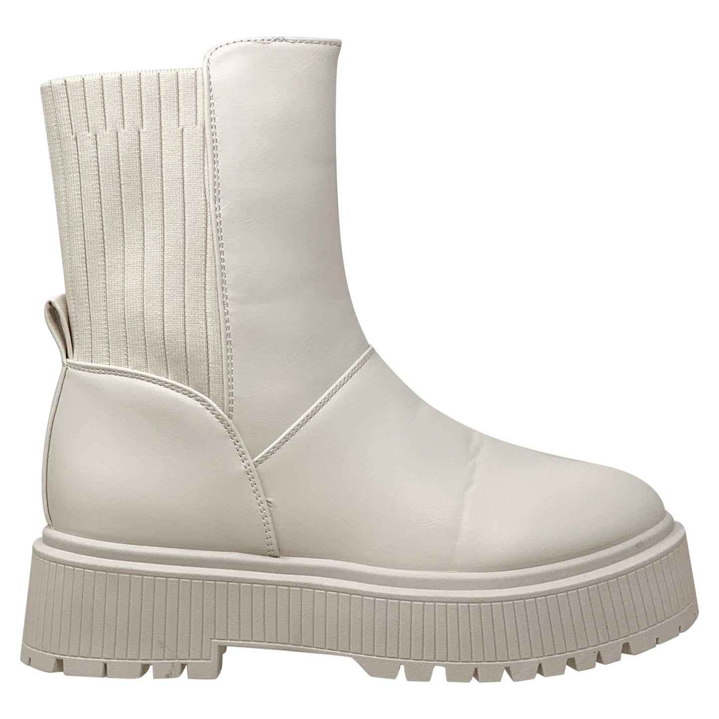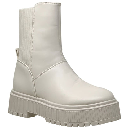 These boots with a combination of style elements, including a sweater-like texture, elastic features for comfort, combat-style design, and a platform sole for added height and fashion, suitable for various occasions, on specific designs and features.