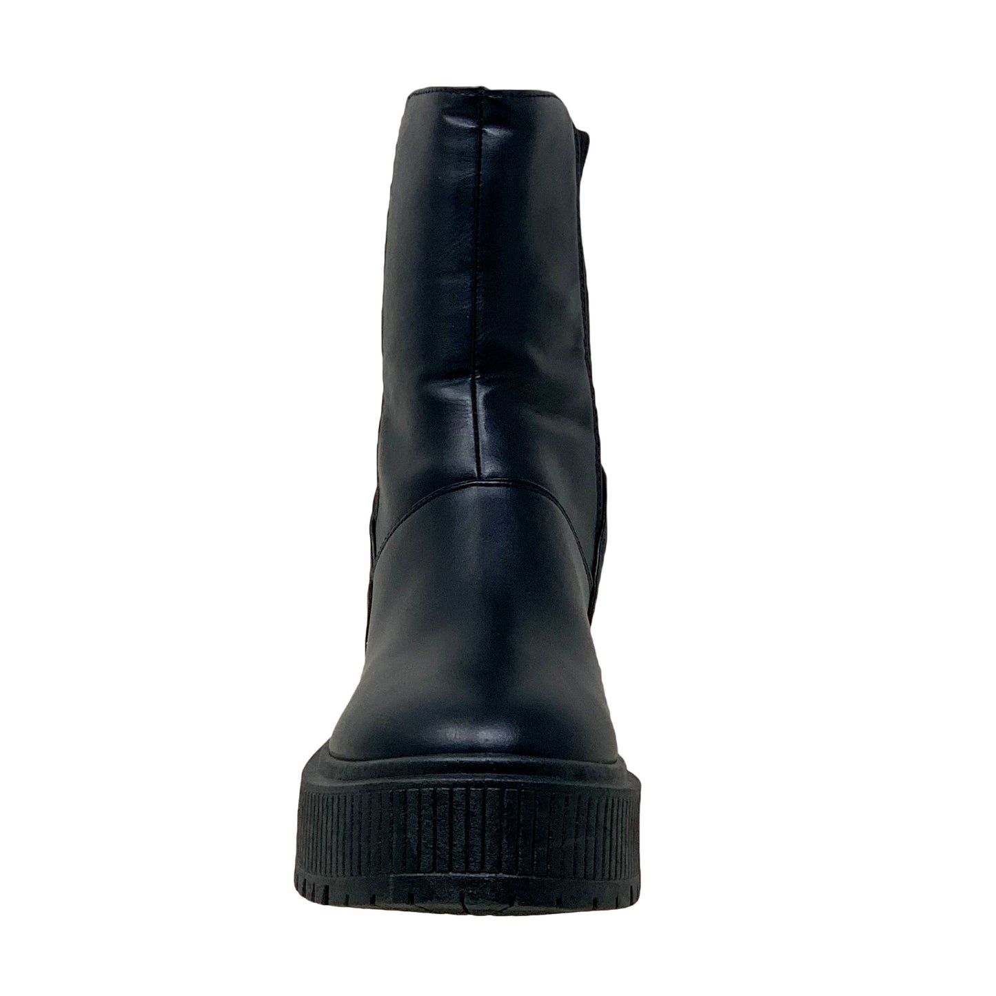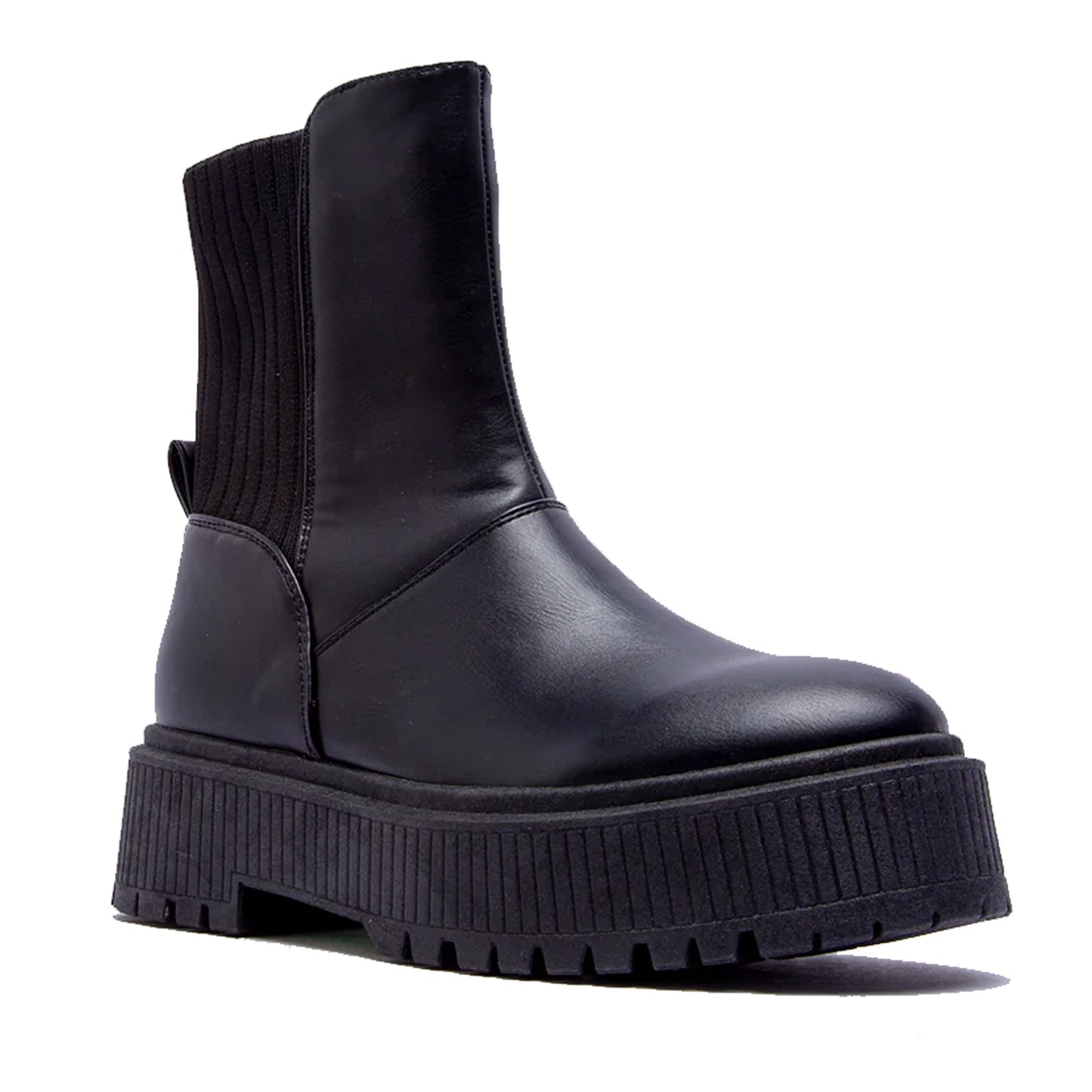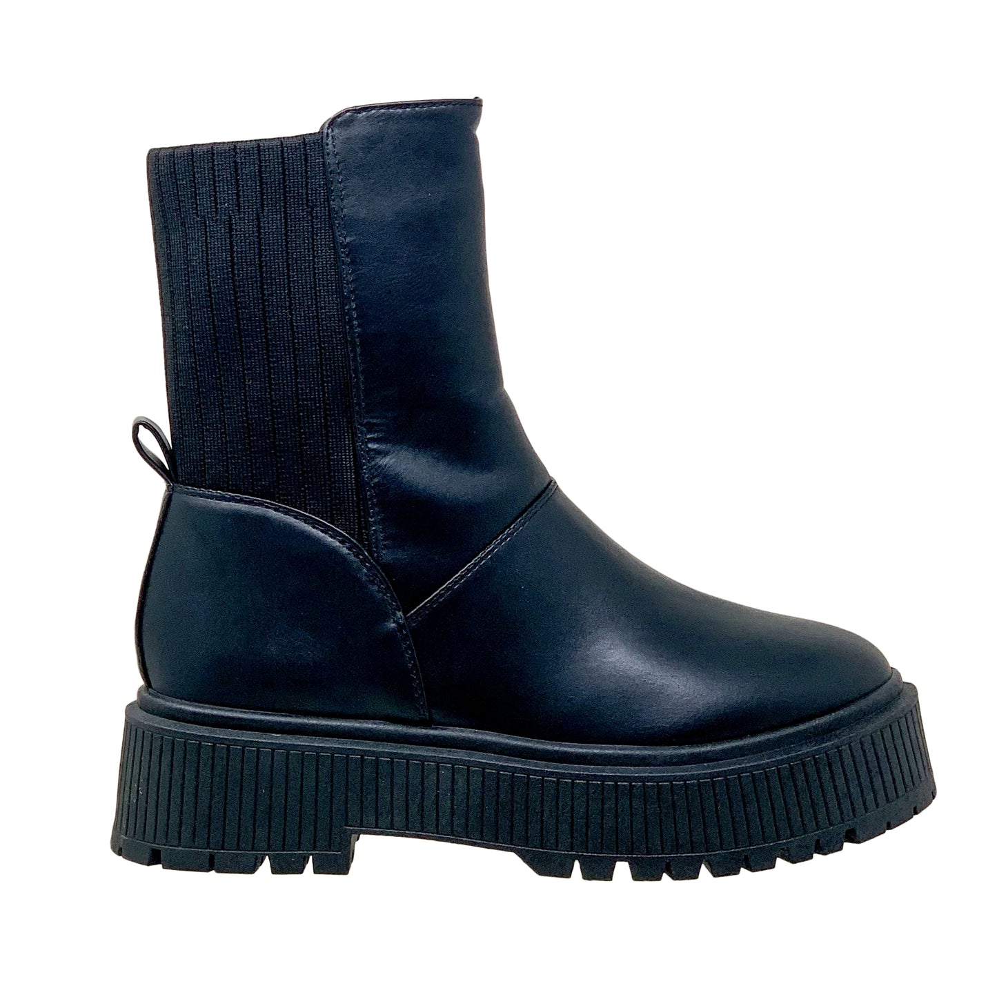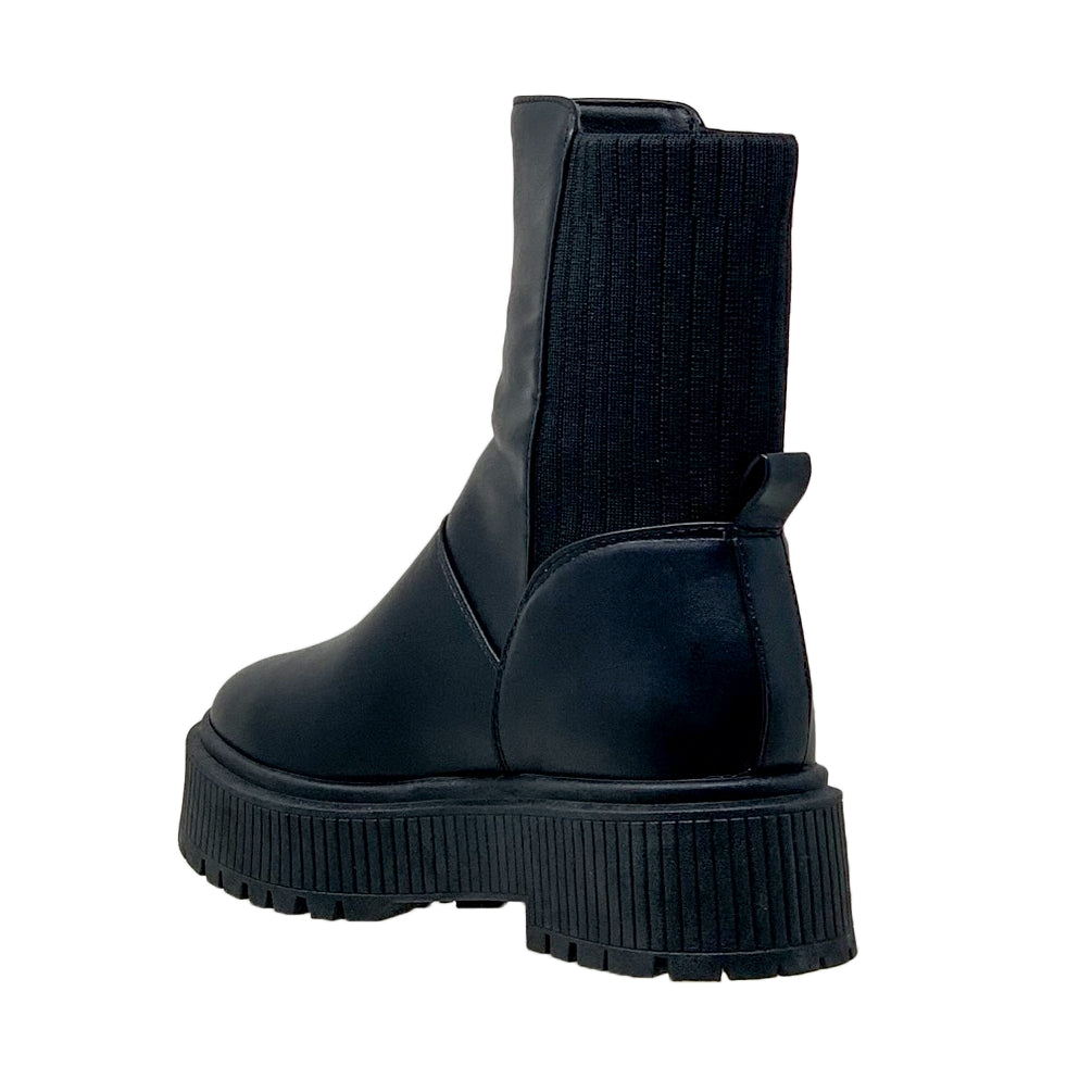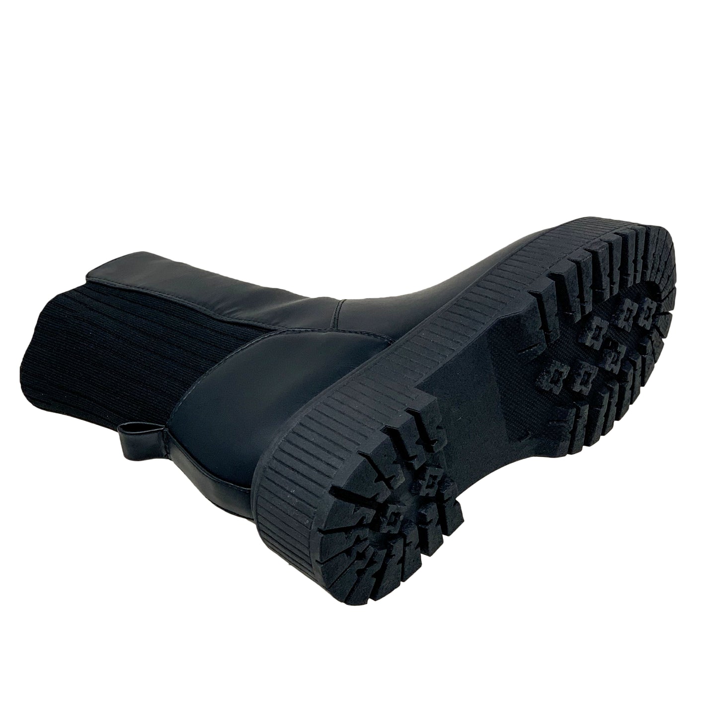These boots with a combination of style elements, including a sweater-like texture, elastic features for comfort, combat-style design, and a platform sole for added height and fashion, suitable for various occasions, on specific designs and features.