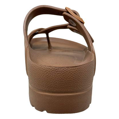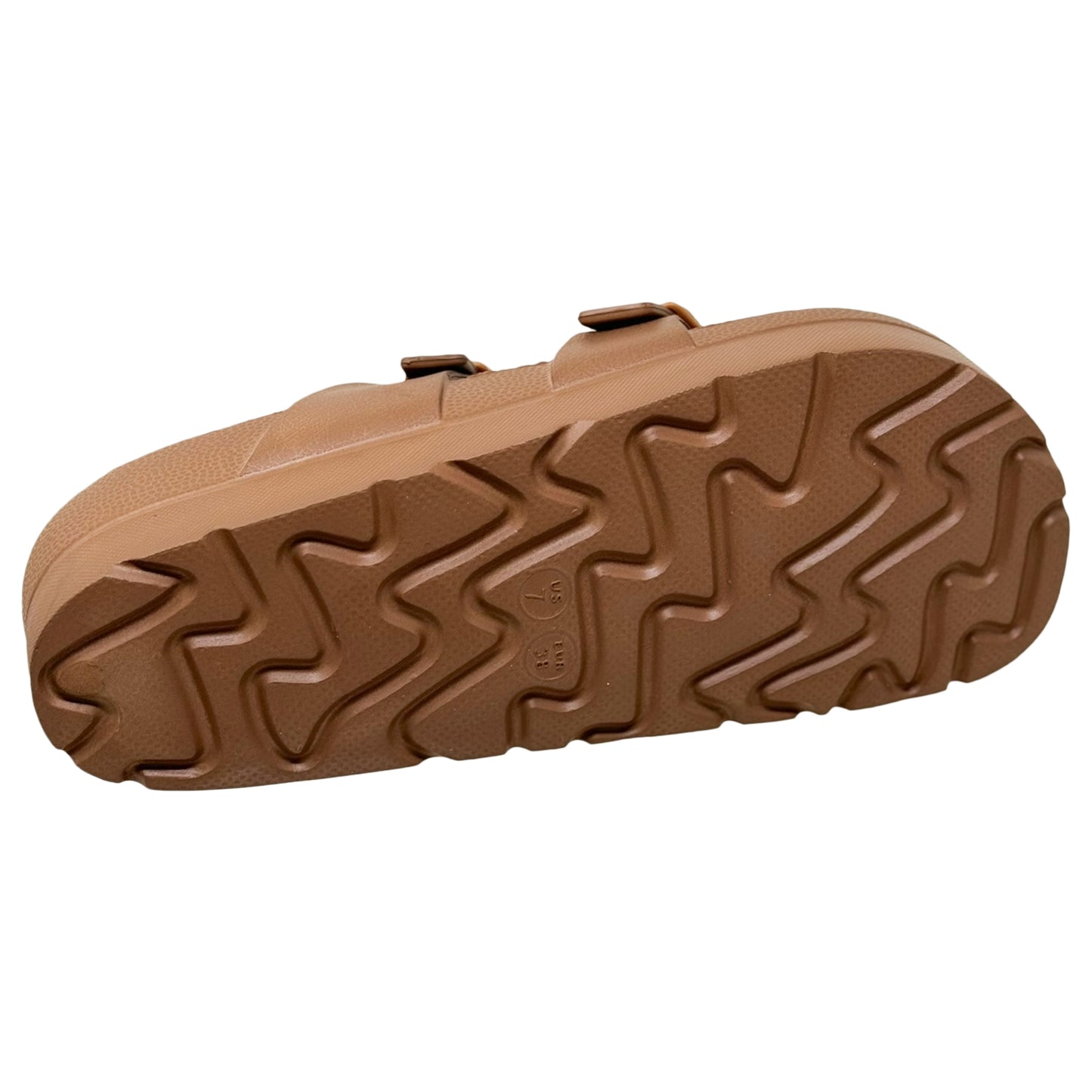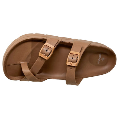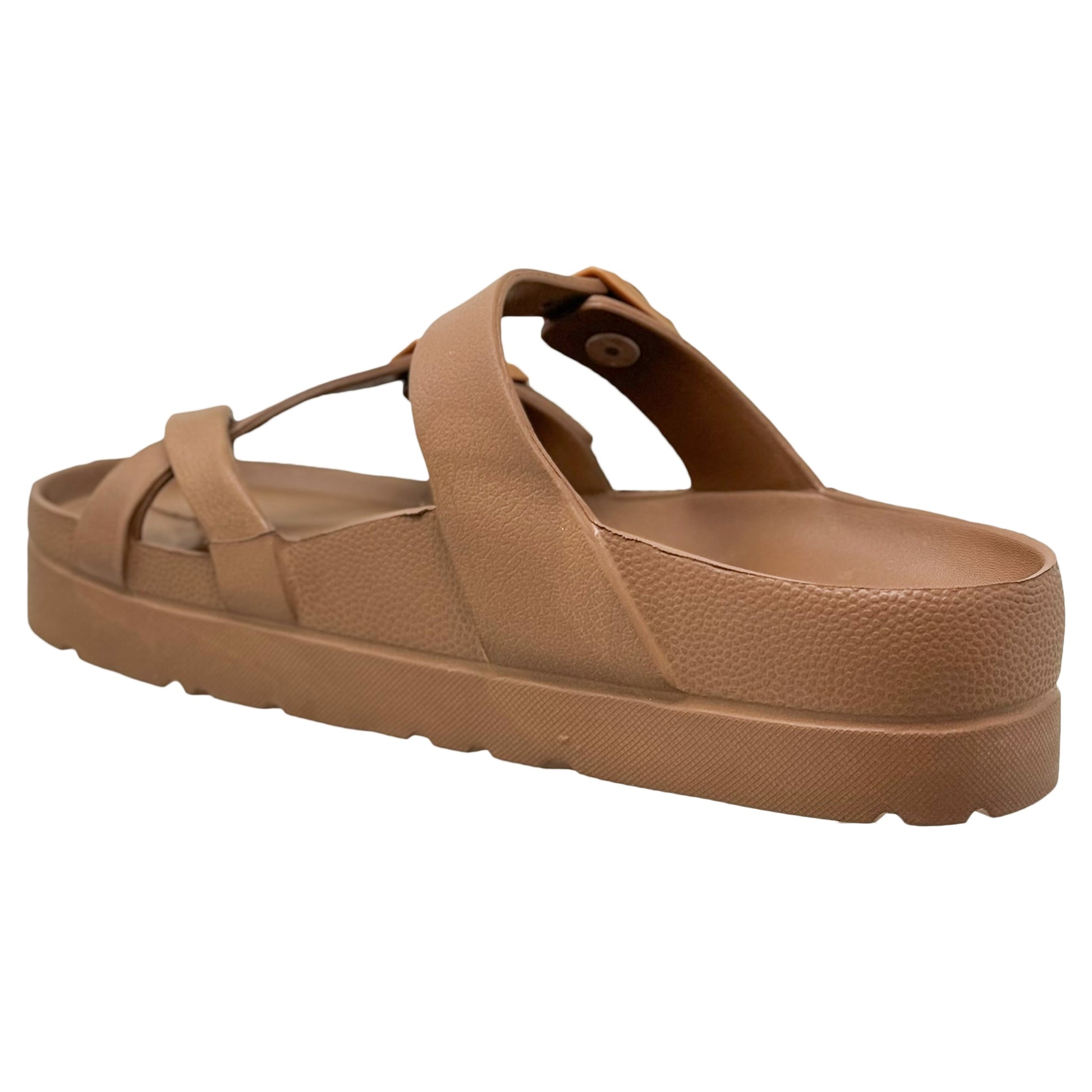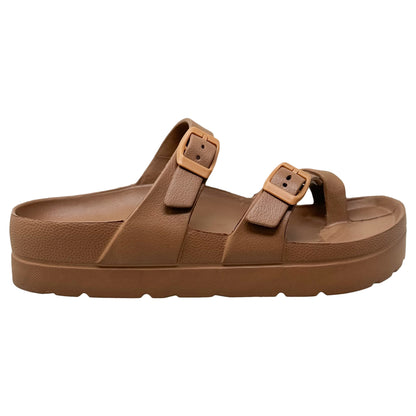 - Slide sandal with toe strap and dual buckle straps