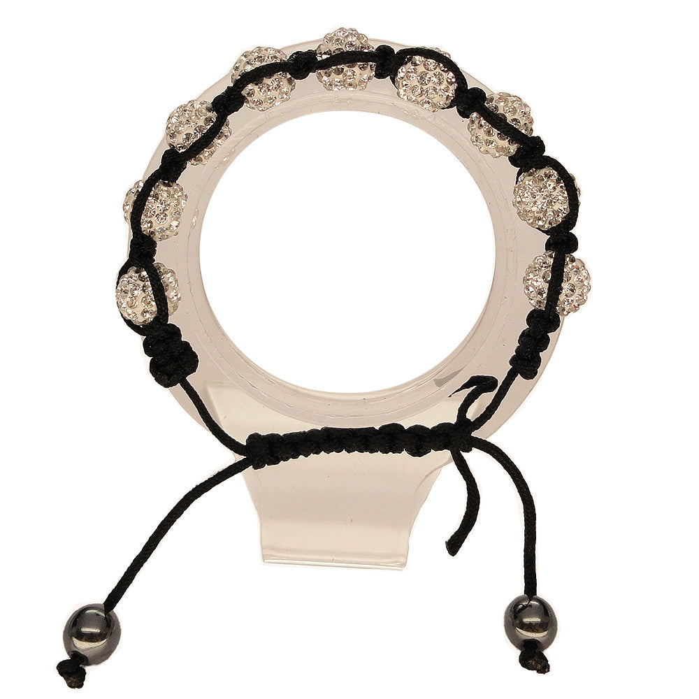 Features stunning rhinestone balls with woven adjustable straps made of nylon, make it easy to expand or shrink this bracelet to fit several wrist sizes. Materials- Nylon, Rhinestones. Available in Purple, Green, Yellow, Multi, Blue, Silver, and Black.