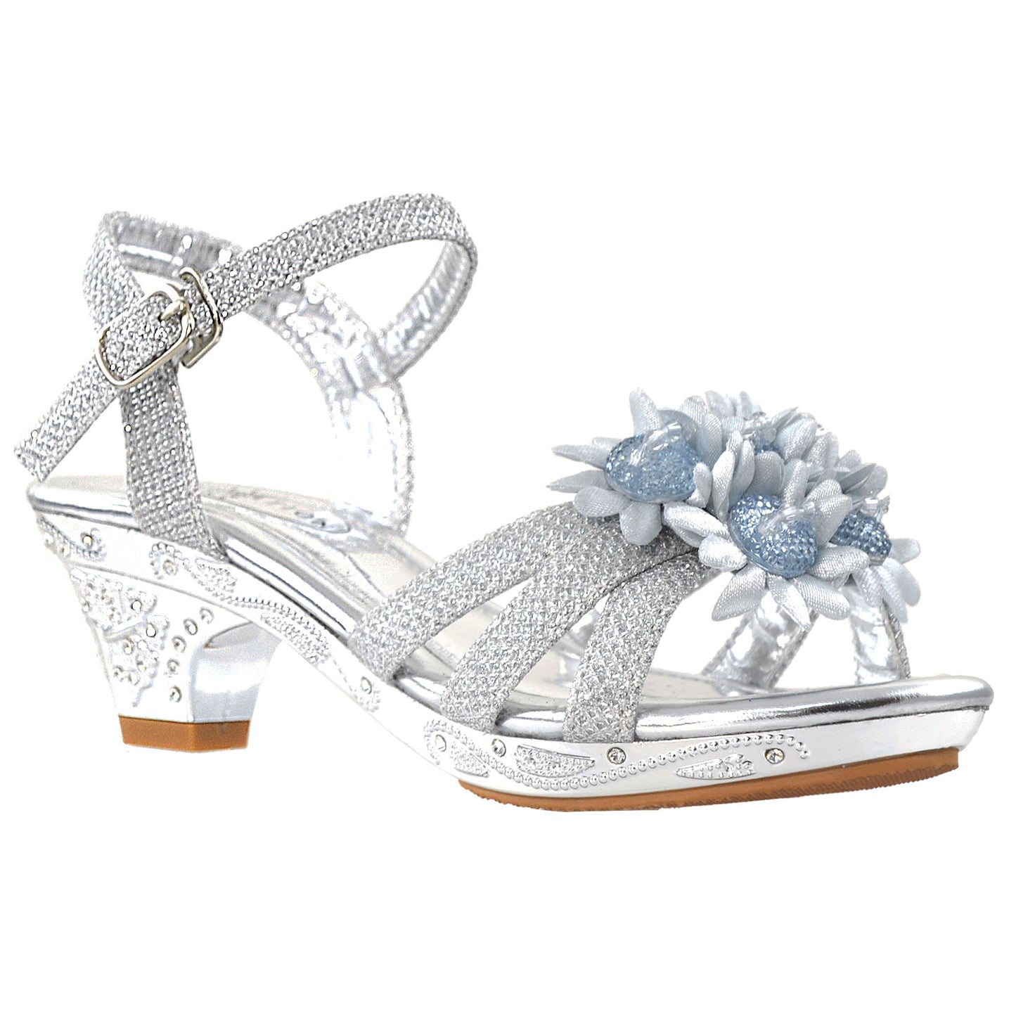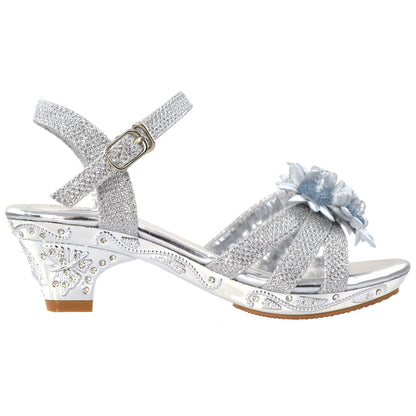 Kids Dress Heel Sandal Rhinestone Ankle Strap Flower Accent