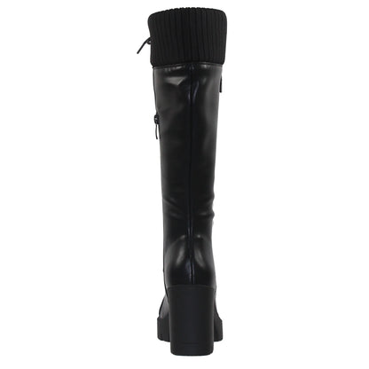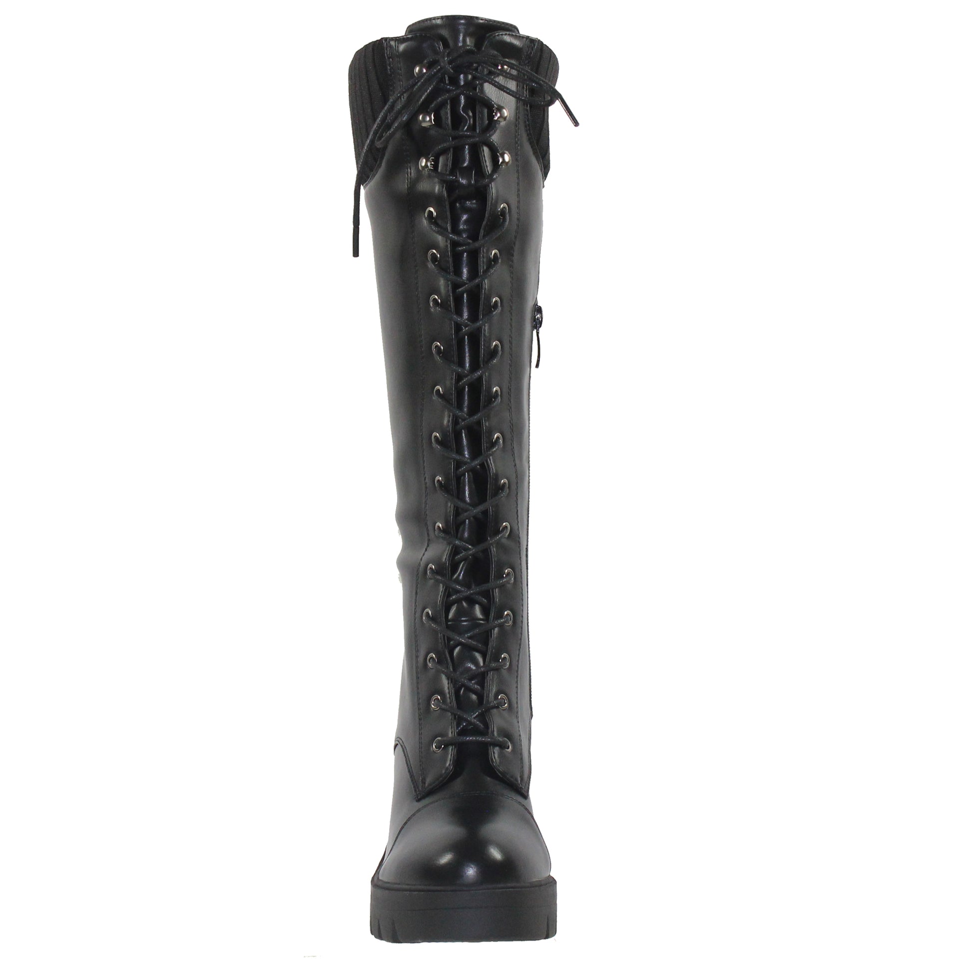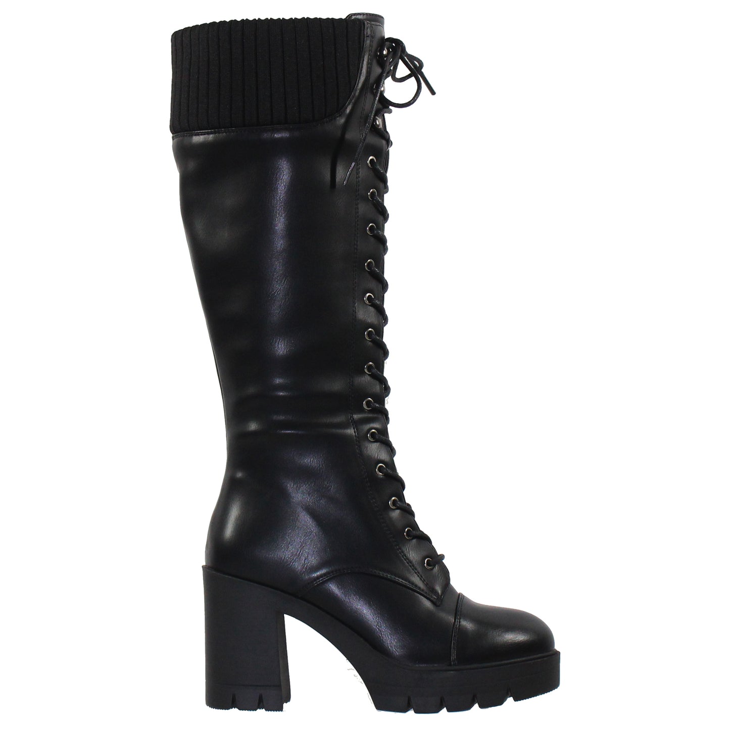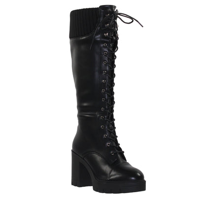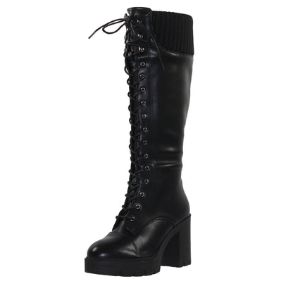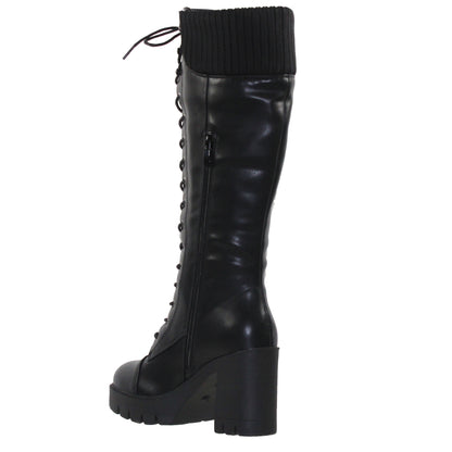 Women Lace Up Chunky Heel Knitted Cuff Combat Boots Black PU