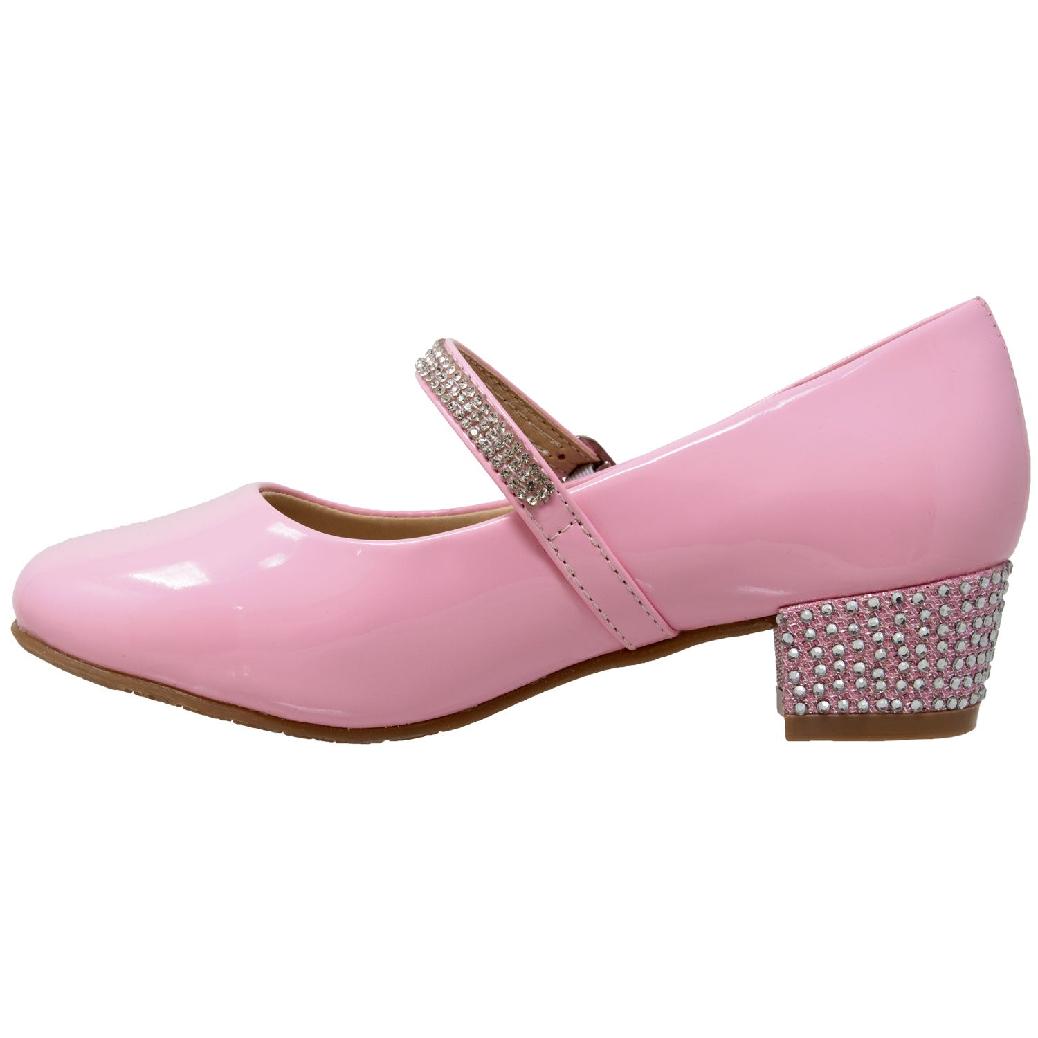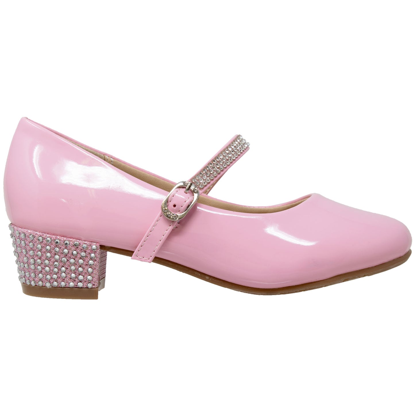 • Adjustable buckle ankle strap; Rhinestone embellishments; Block Heel