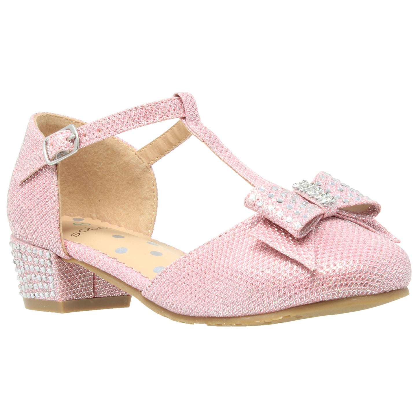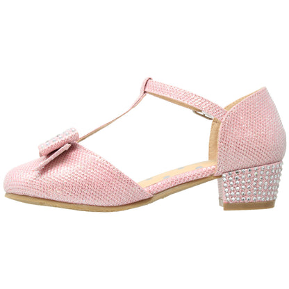 This glamorous mary jane pump is styled with a slim t-strap and a cute sparkly bow. A low heel set with sparkly crystals add the right amount of lift and the all over dazzling glitter puts the finishing touch on this stunning pump.