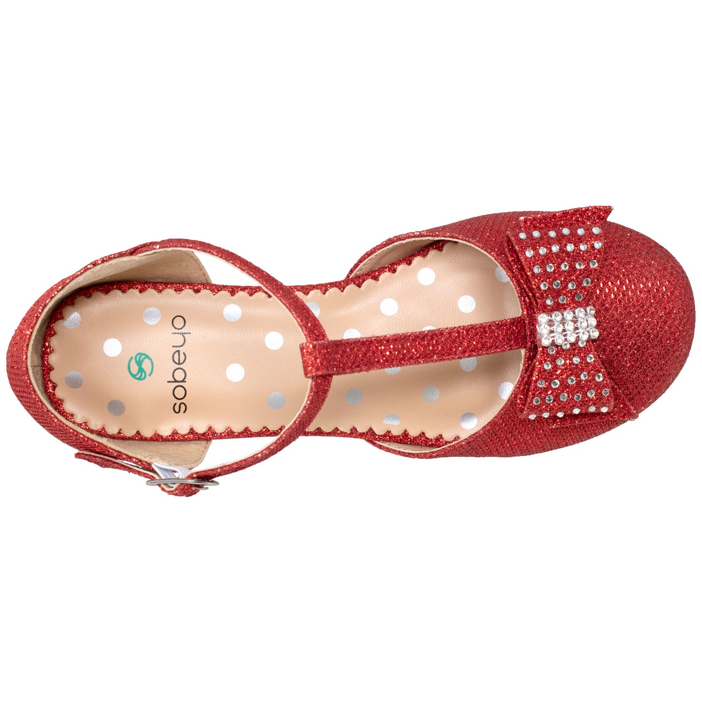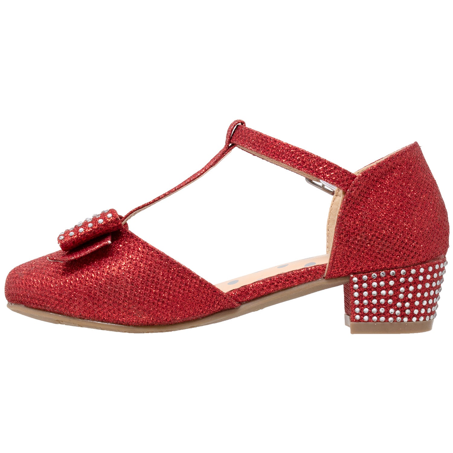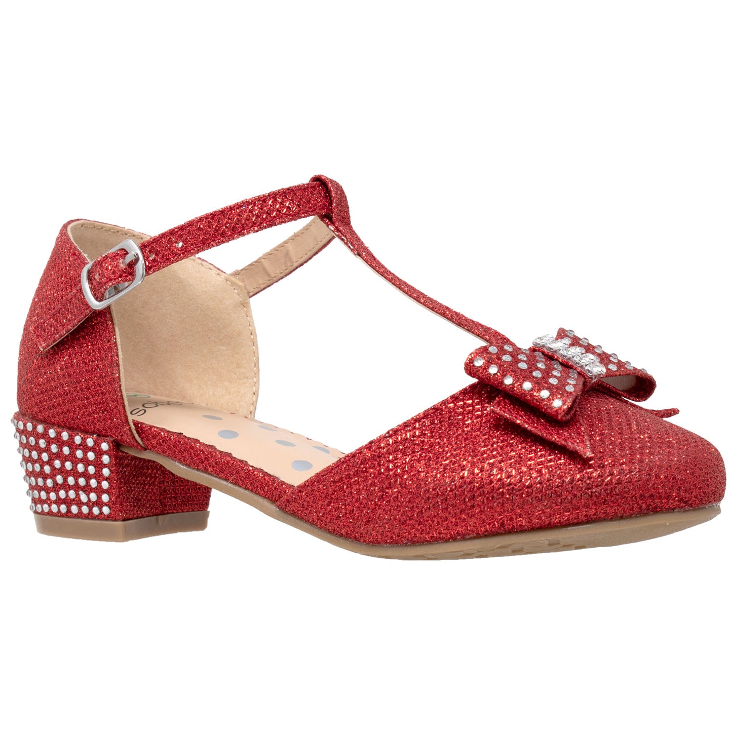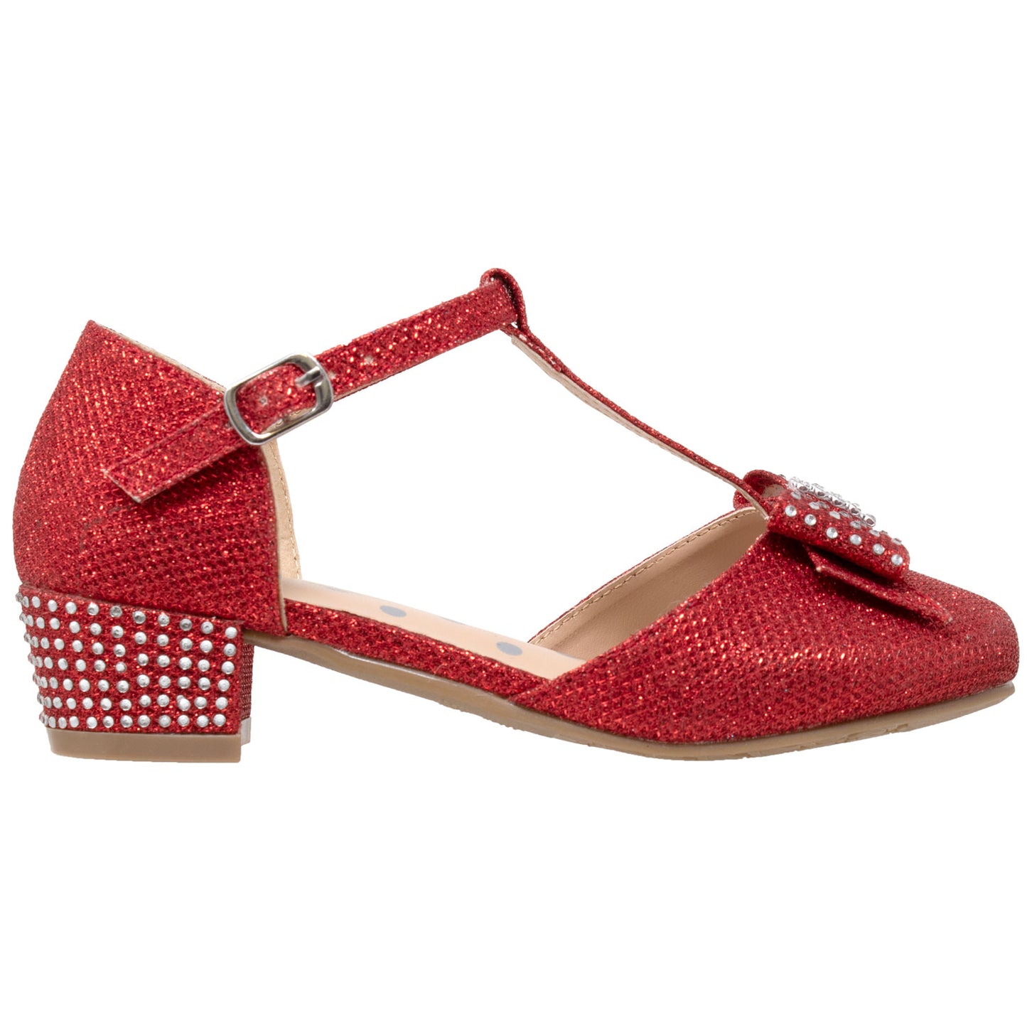 This glamorous mary jane pump is styled with a slim t-strap and a cute sparkly bow. A low heel set with sparkly crystals add the right amount of lift and the all over dazzling glitter puts the finishing touch on this stunning pump.
