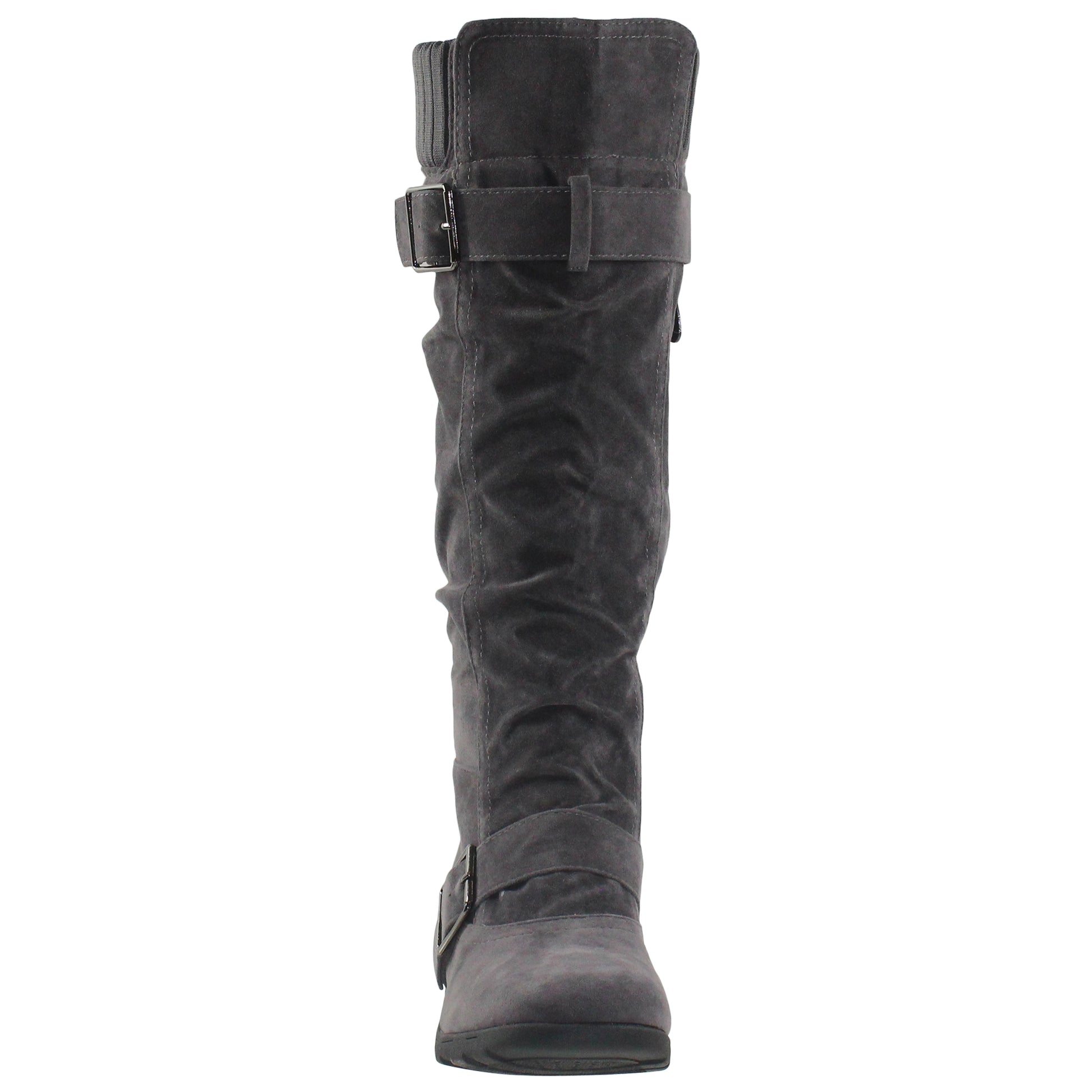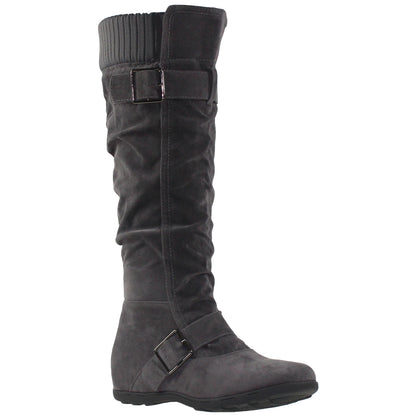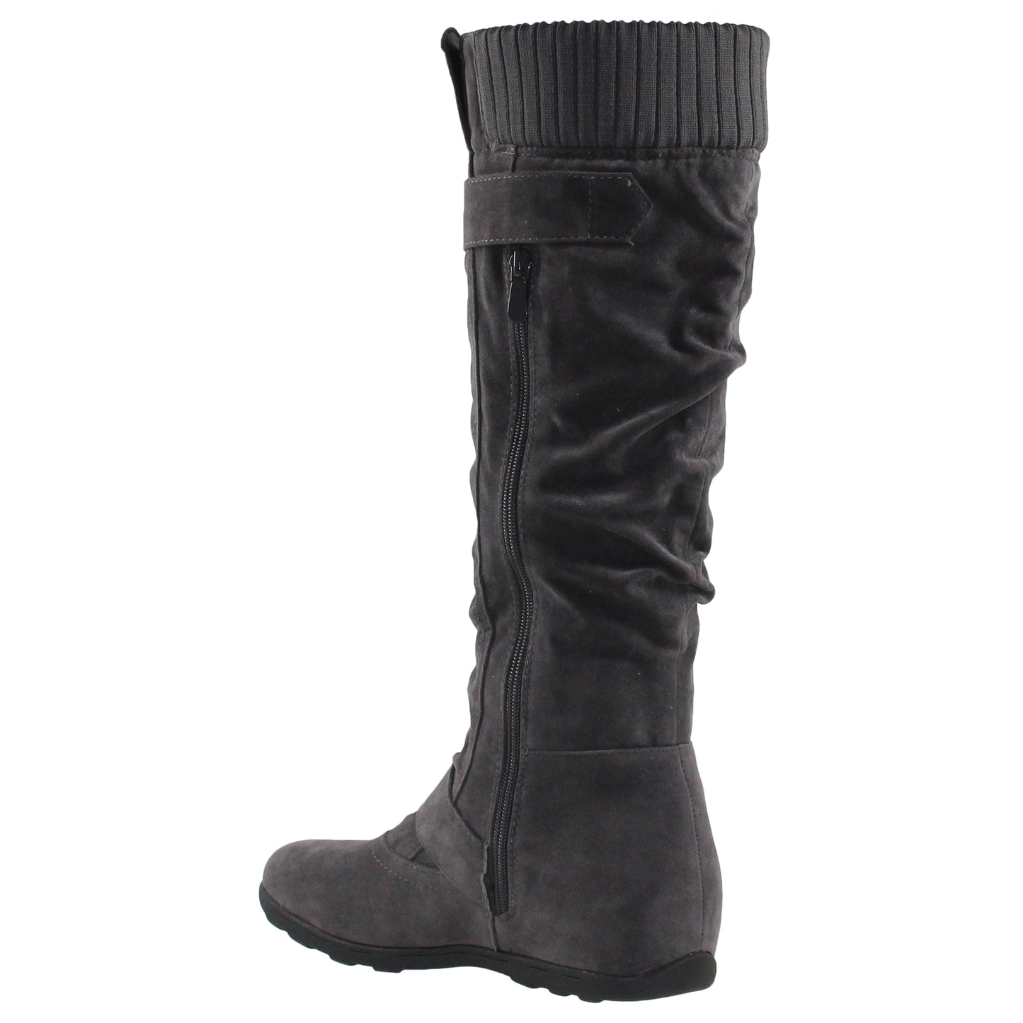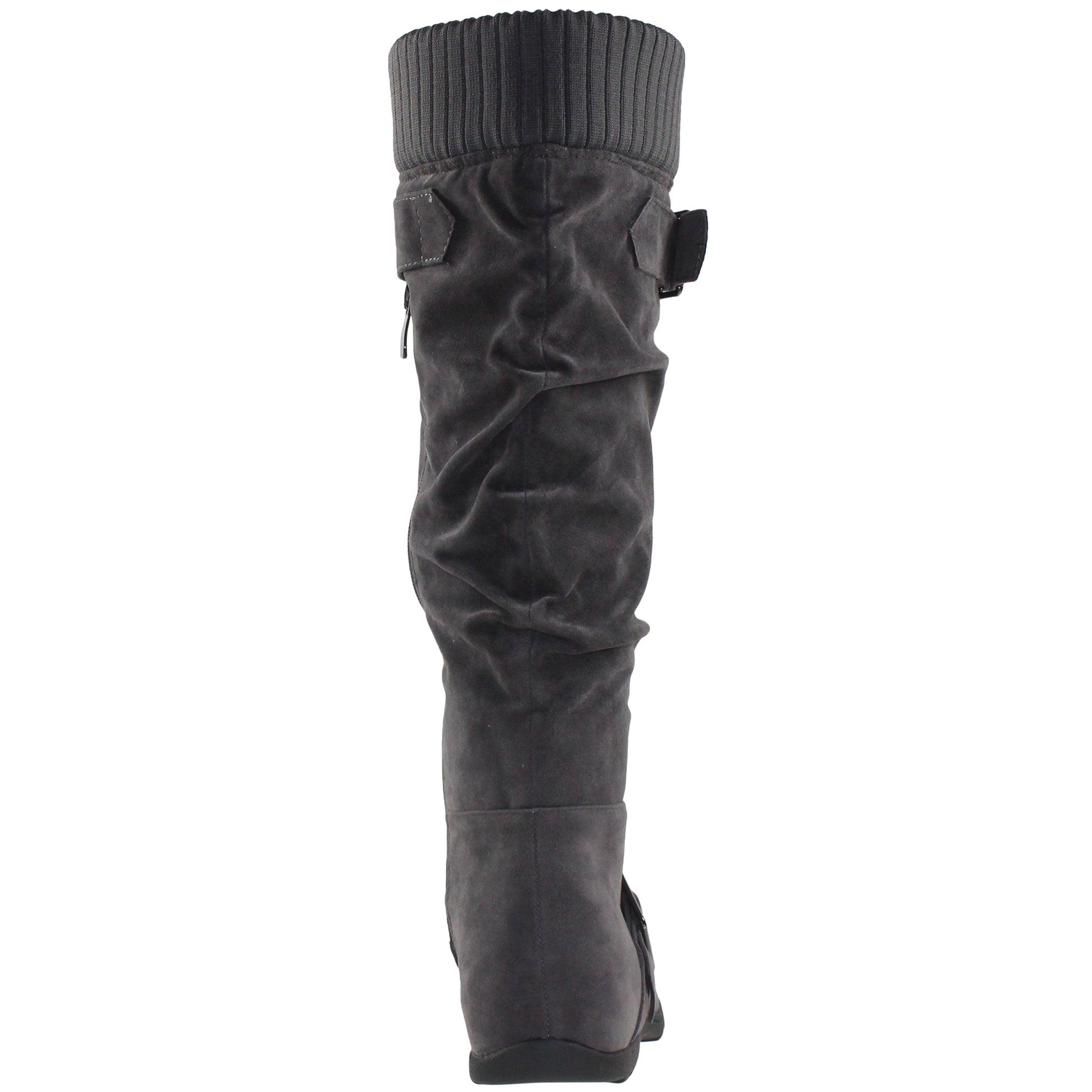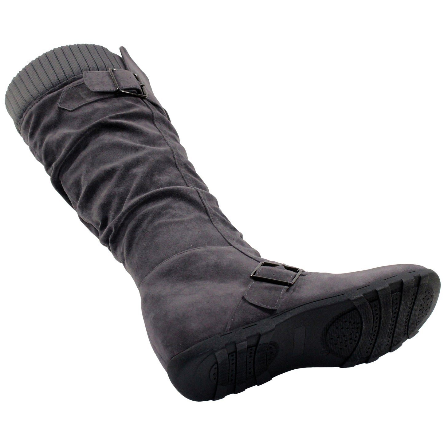 SOBEYO Women's Boots Ruched Knit Cuff Double Straps Buckles Gray Suede