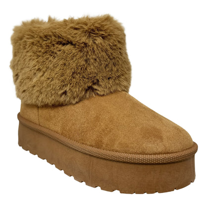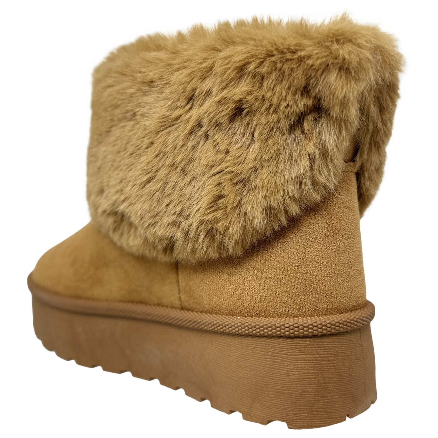 Women's Platform Booties Faux Suede Fur Lining Pull On Cuff Boots Tan Suede
