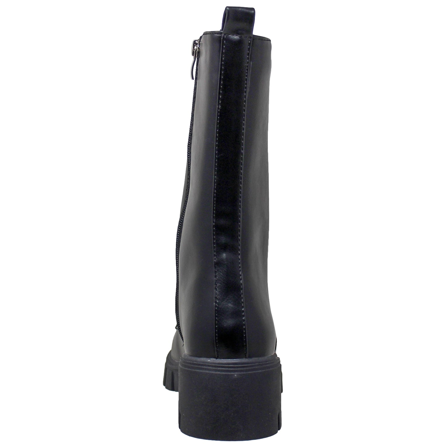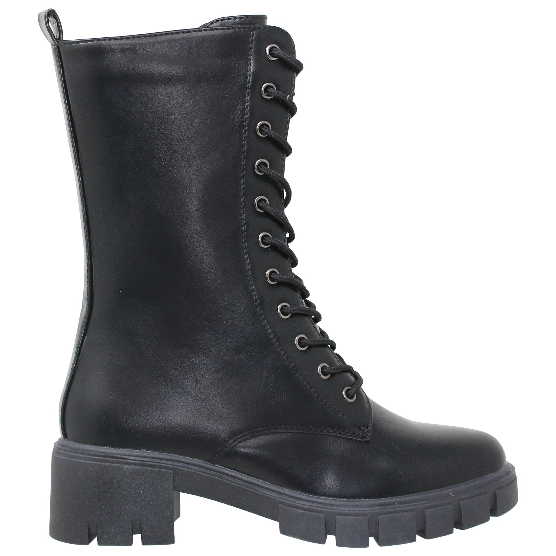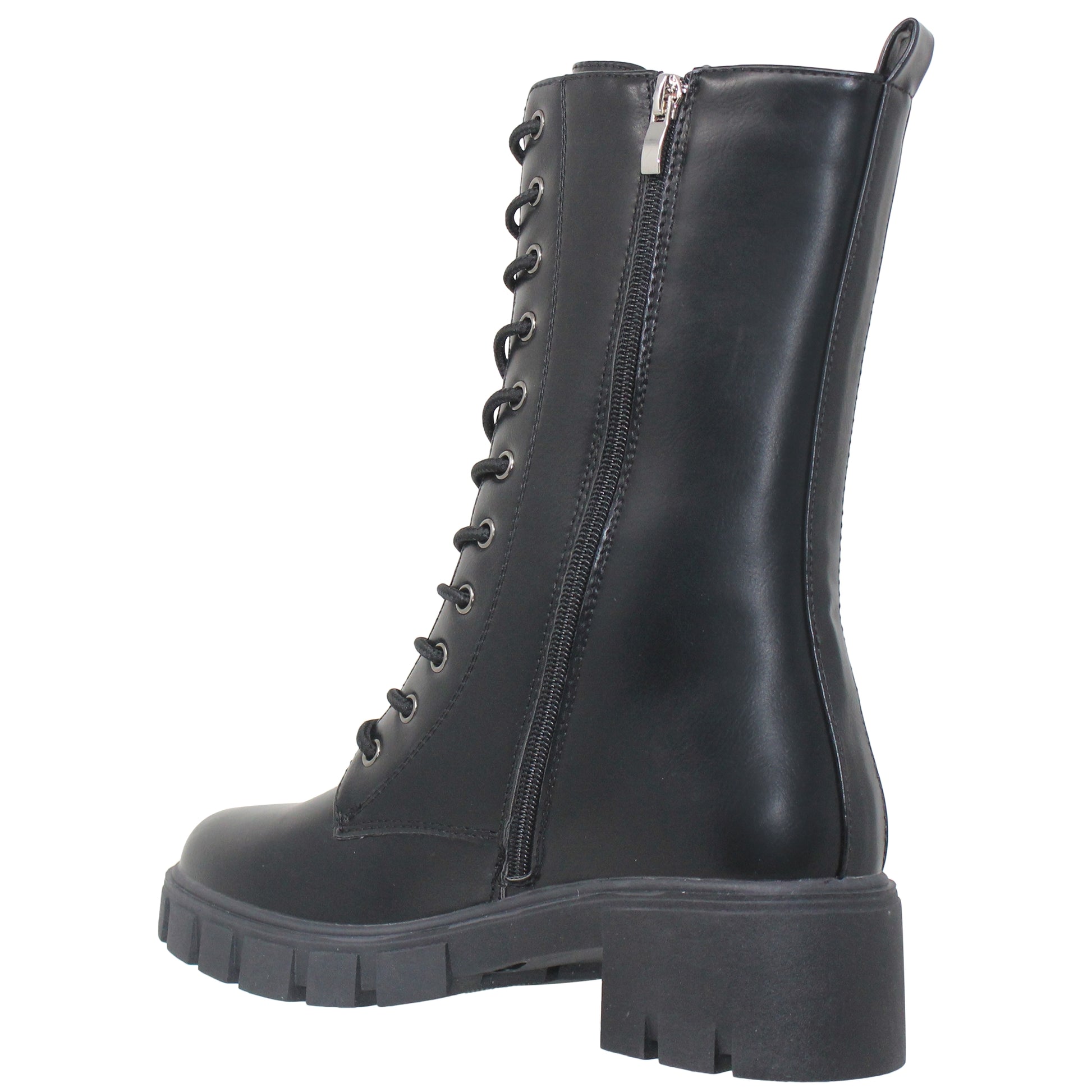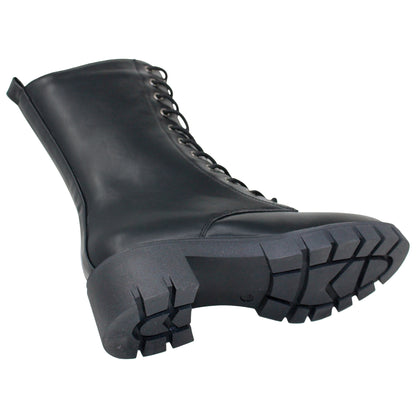 These Combat Ankle Boots feature a vegan leather construction, front lace-up closures, a tall ankle shaft with pull tabs on the back, and chunky platform soles.
