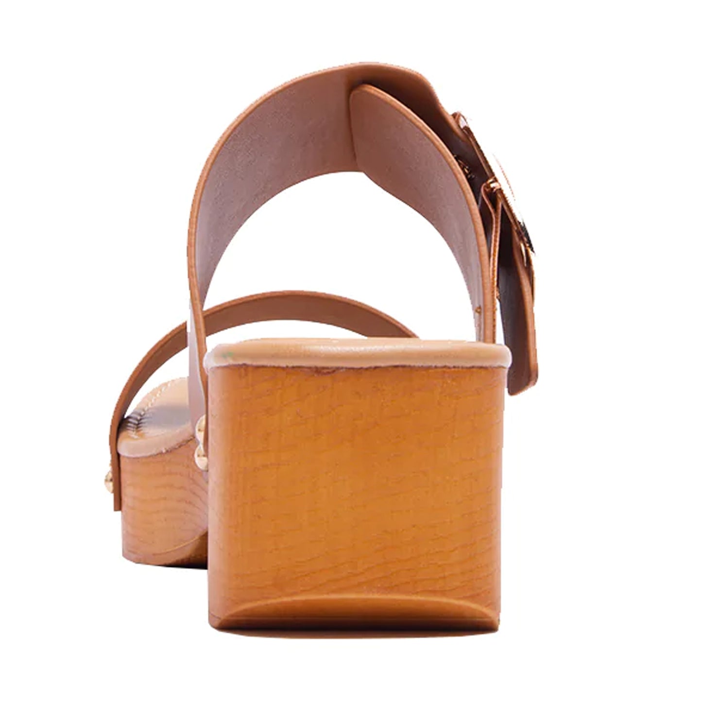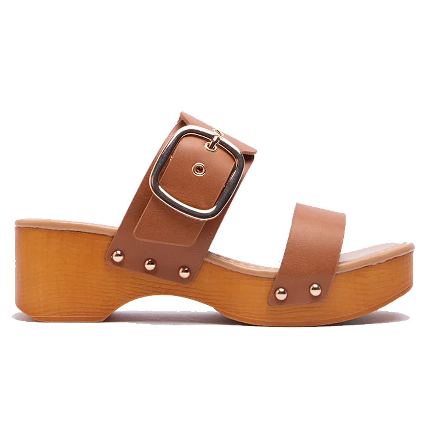 Double Adjustable Buckle Straps Slip On Wood Accents Sandals Tan