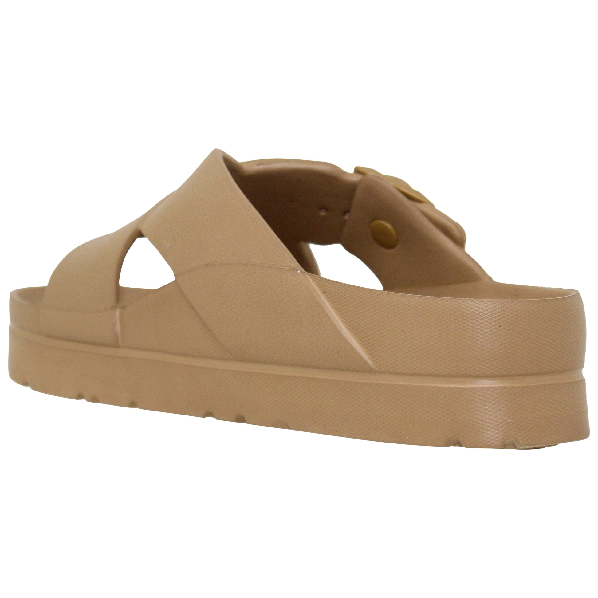 - Slide sandal with Criss-cross strap and dual buckle adjustable straps