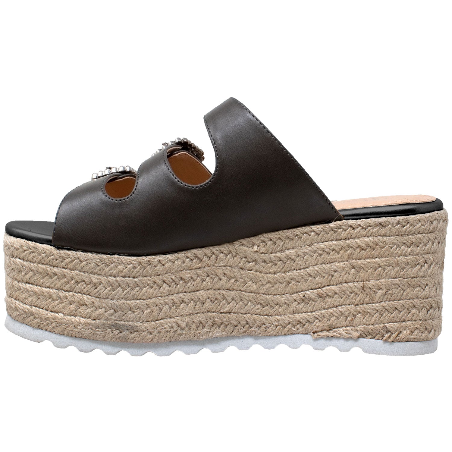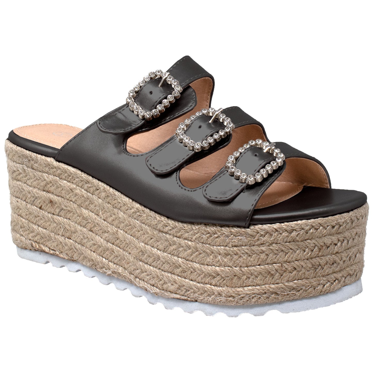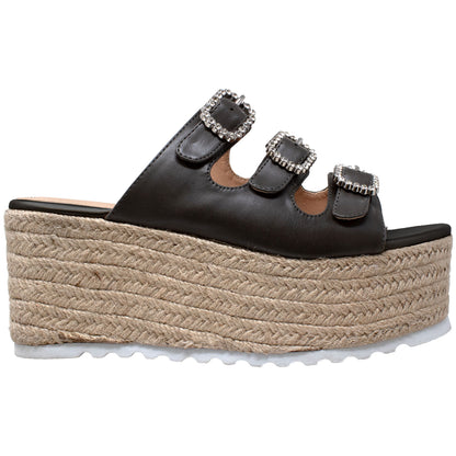 Metal hardware accented with shiny crystals adorn the straps of this statement defining sandal while rows of braided jute wrap along a bold platform.