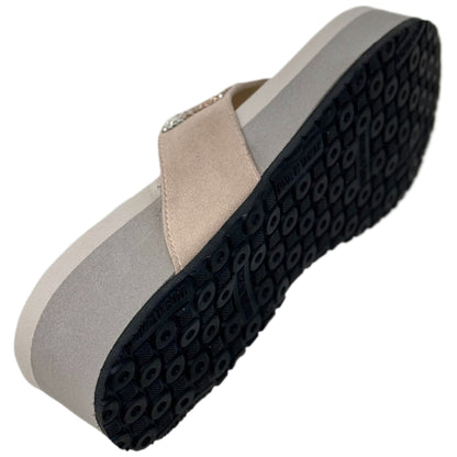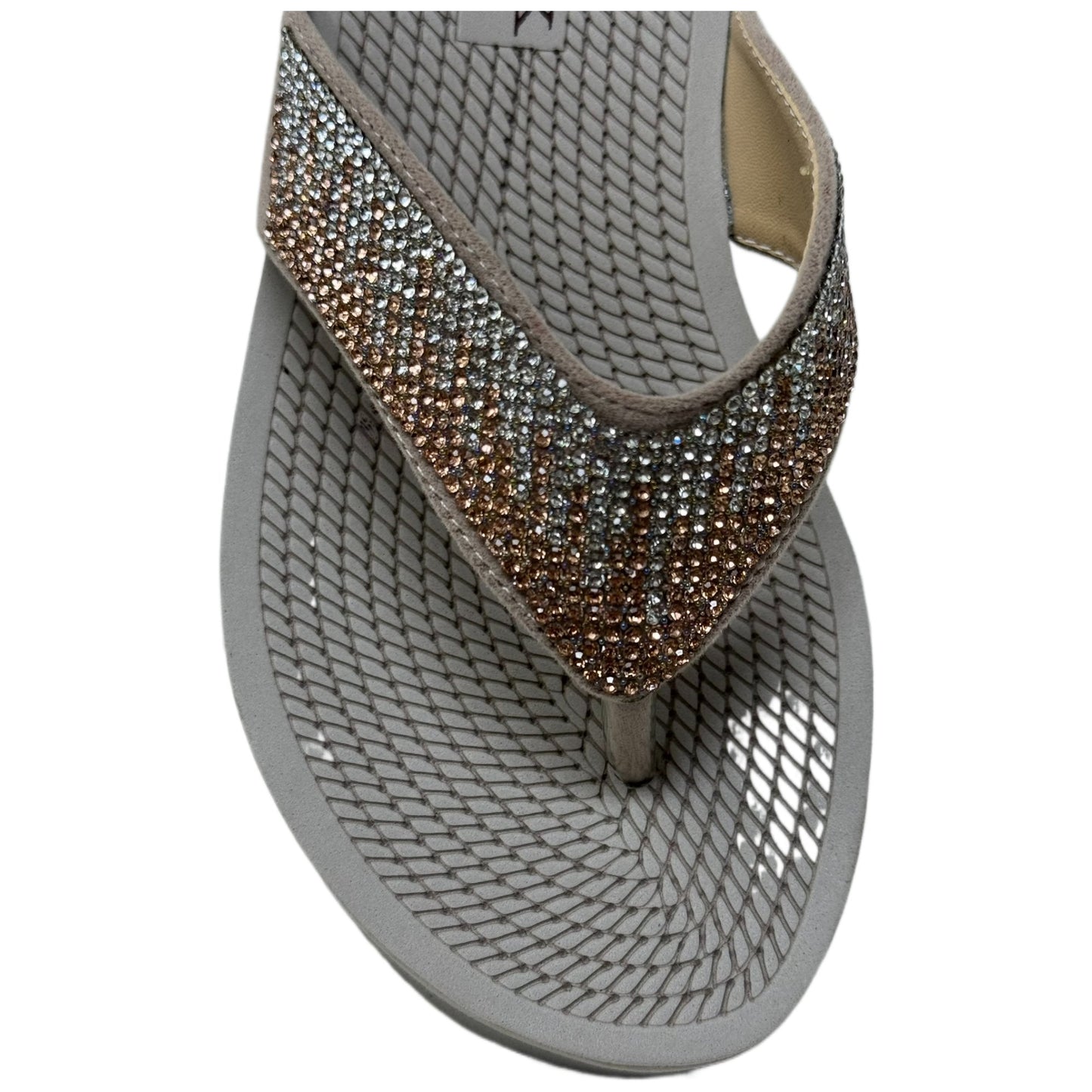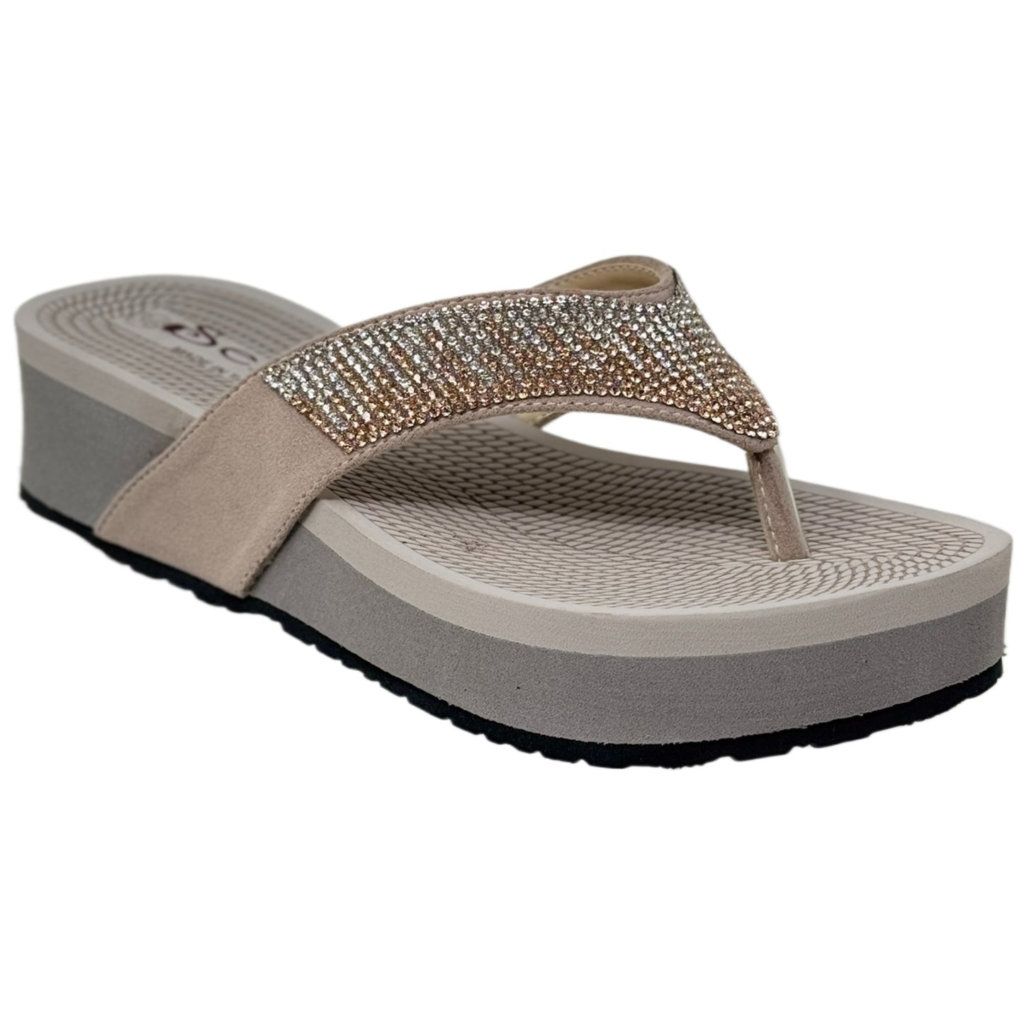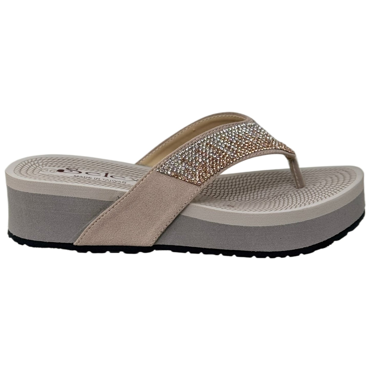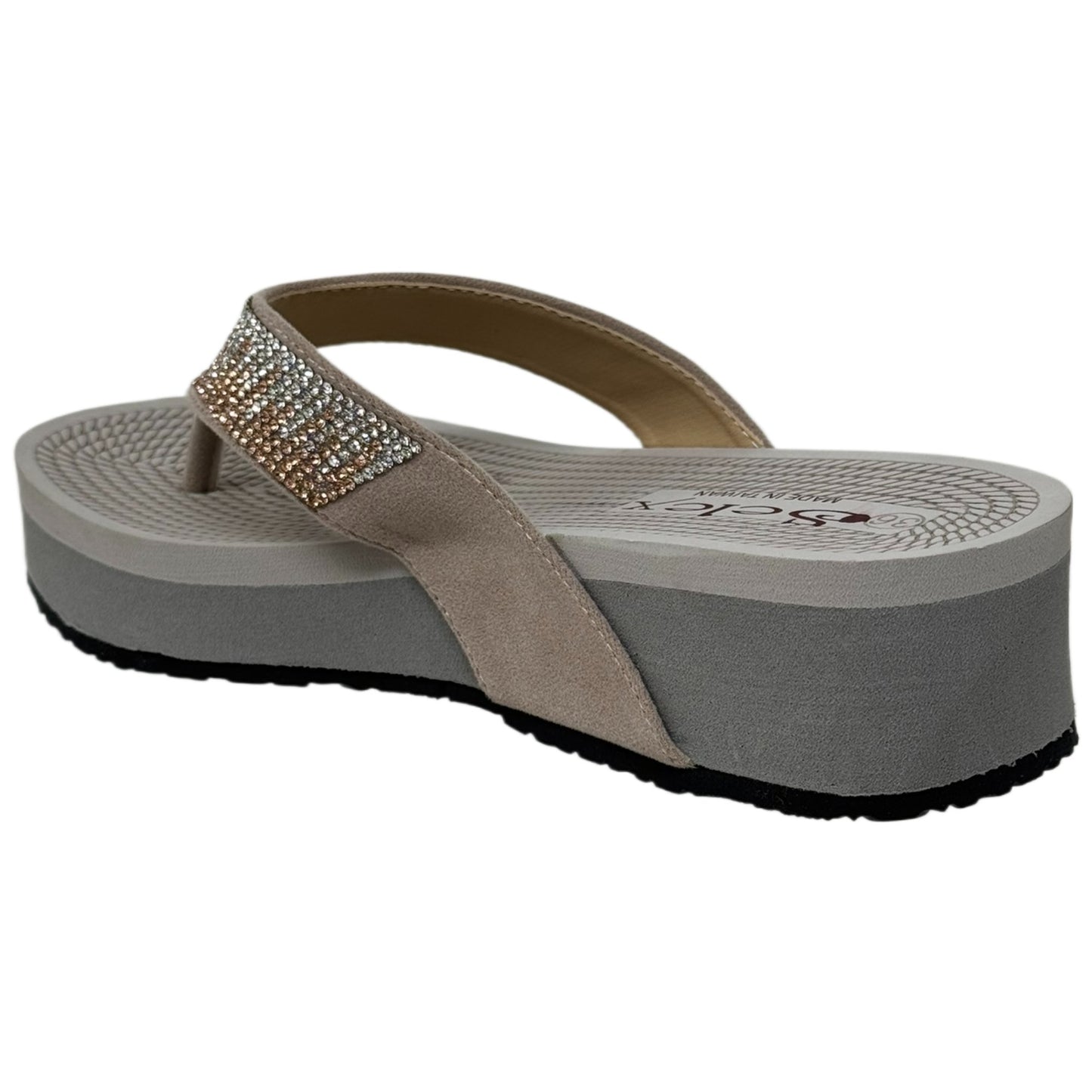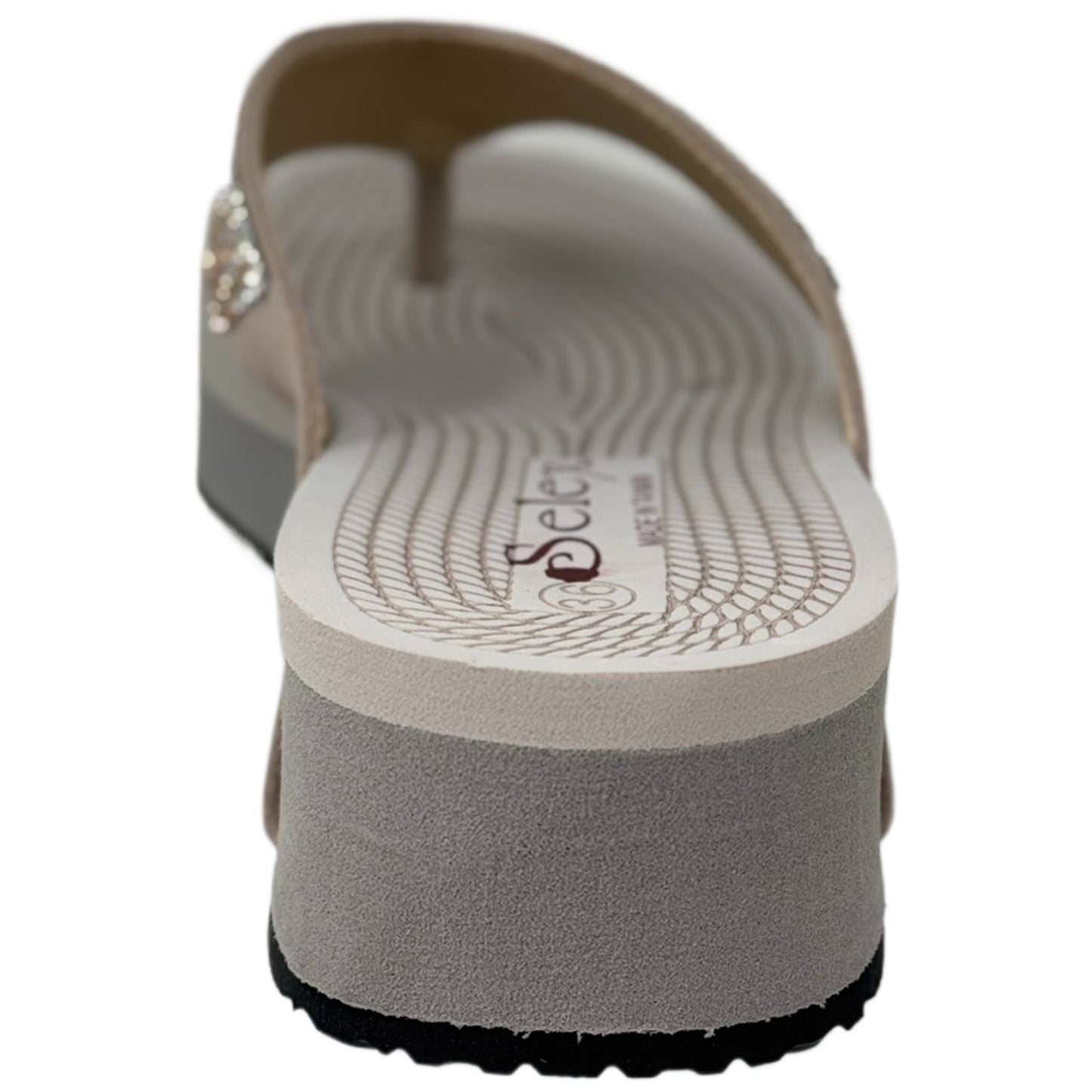 Upper: Soft faux suede thong-style upper decorated with shimmering rhinestones for a chic, feminine look. Smooth inner lining ensures a gentle feel on your feet.